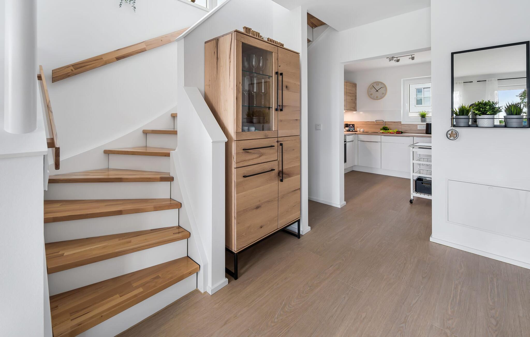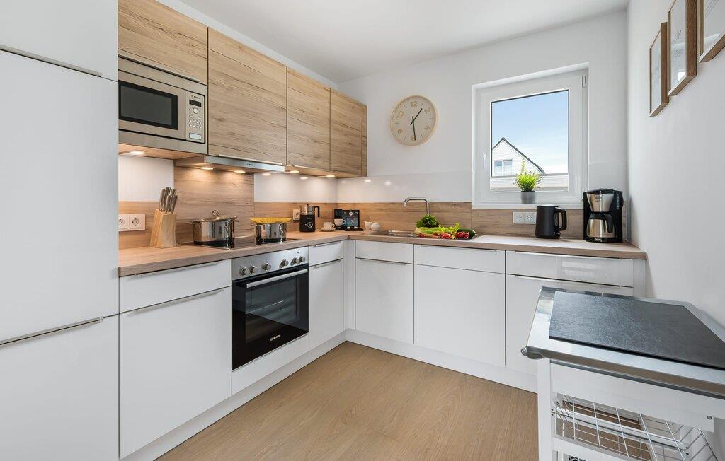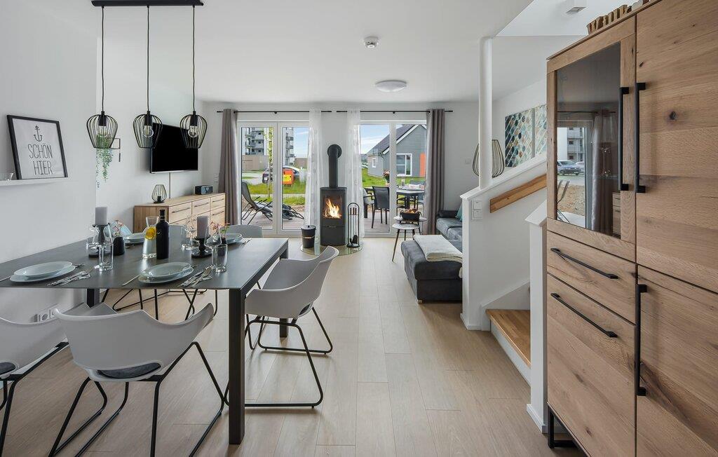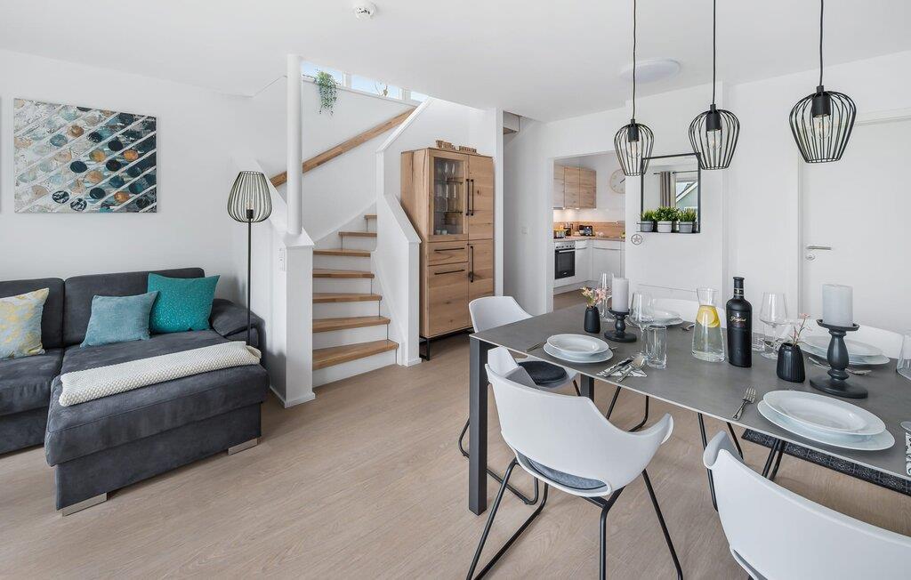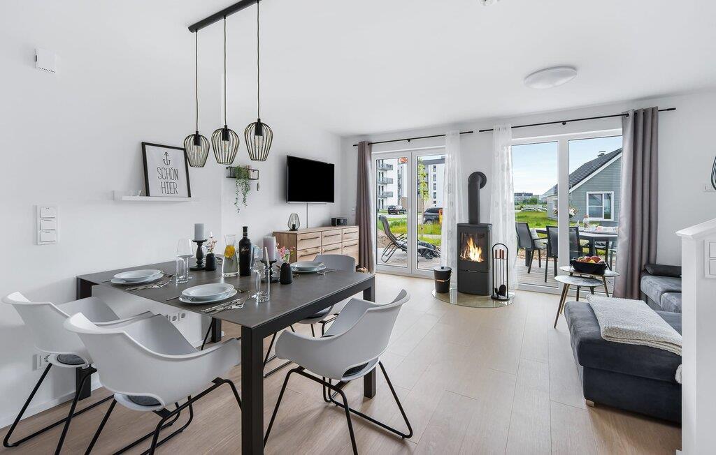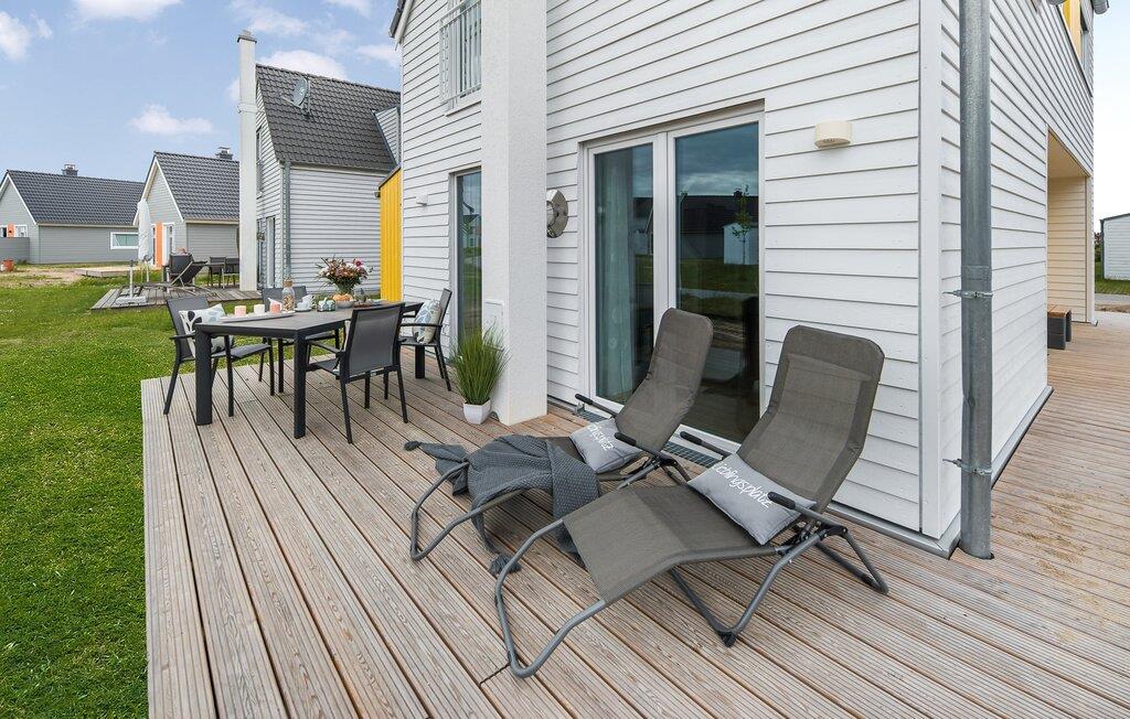 Køkkenet er også udstyret til en høj standard og lader intet tilbage at ønske. Feriehusets afslapningsområde ligger på øverste etage med udsigt over Ostsee og havnen.