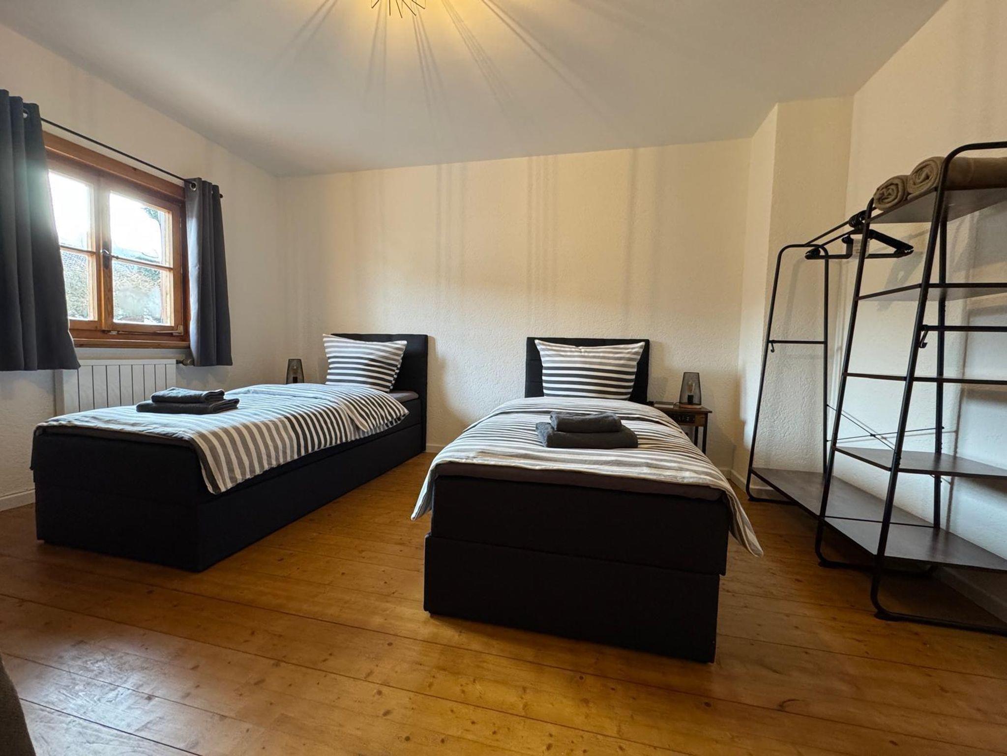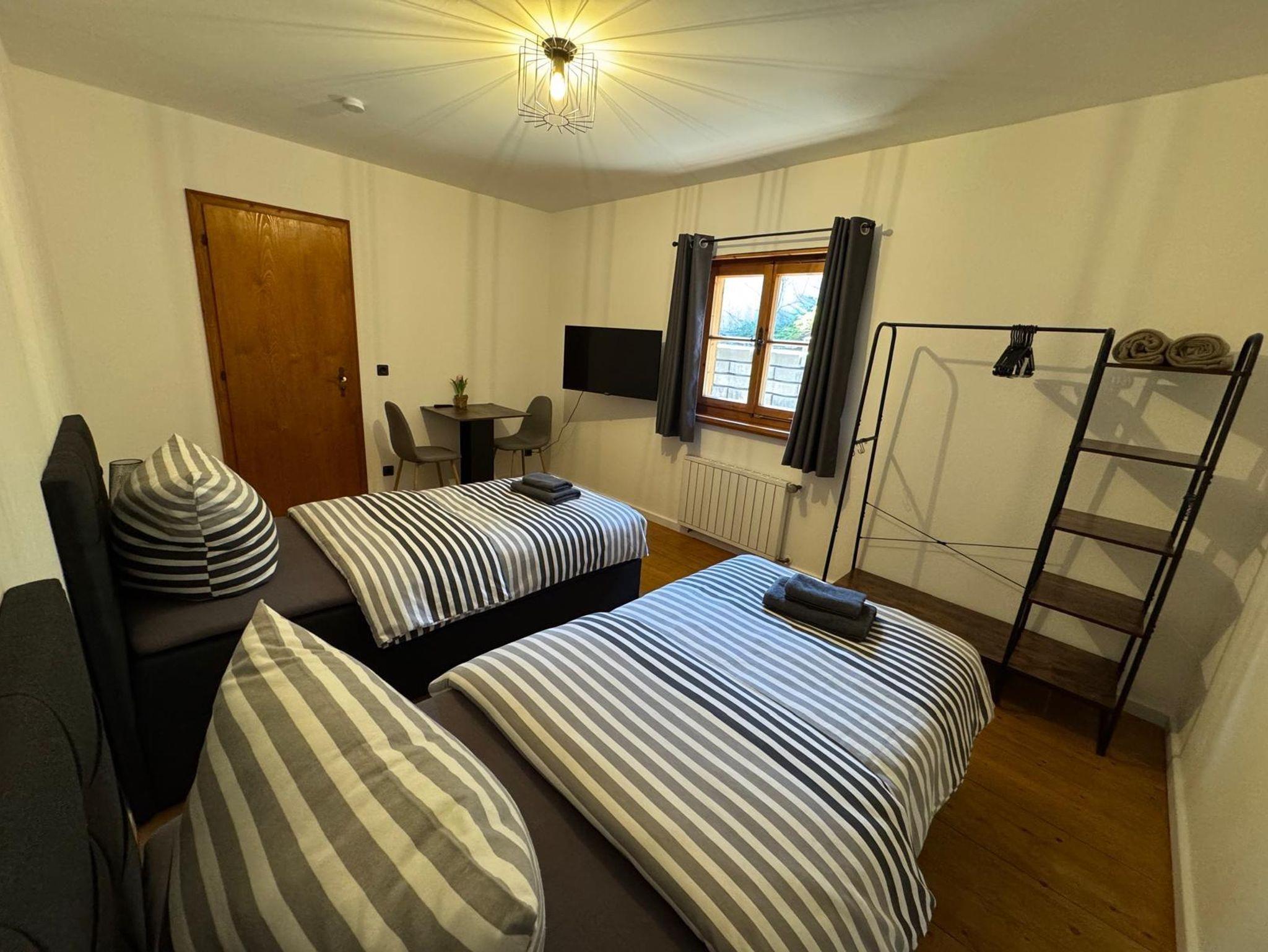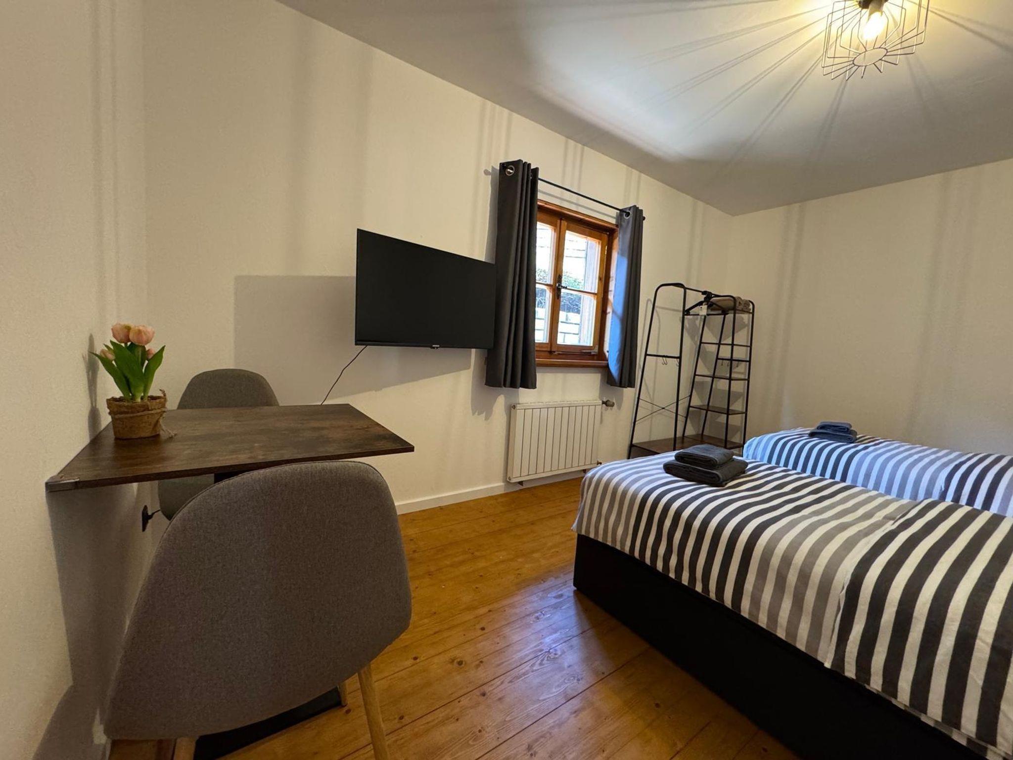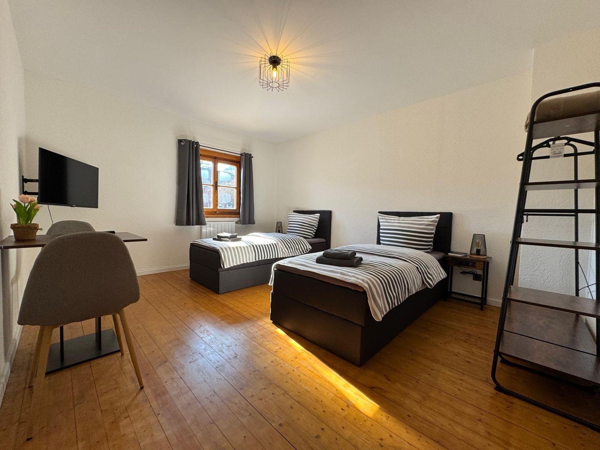 Jedes Schlafzimmer ist mit zwei komfortablen Einzel-Boxspringbetten ausgestattet – ideal für erholsame Nächte. Ausserdem bieten wir einen Tisch mit zwei Stühlen um flexibel die Mahlzeiten im Eigenen Zimmer einnehmen zu können. Die Smart TV‘s sind unter anderem mit Waipu-TV ausgestattet, sodass Sie den gemütlichen Fernsehabend in vollen Zügen genießen können.