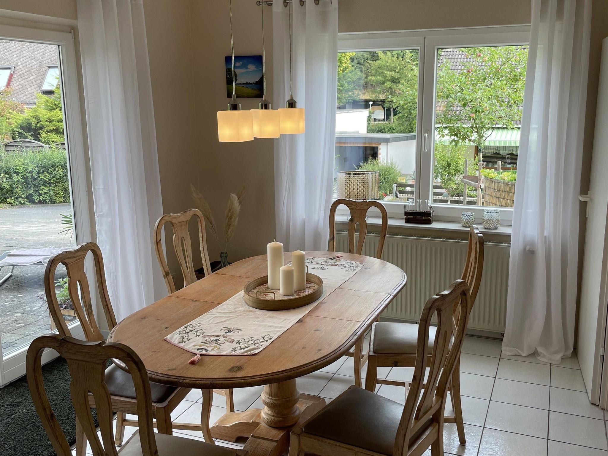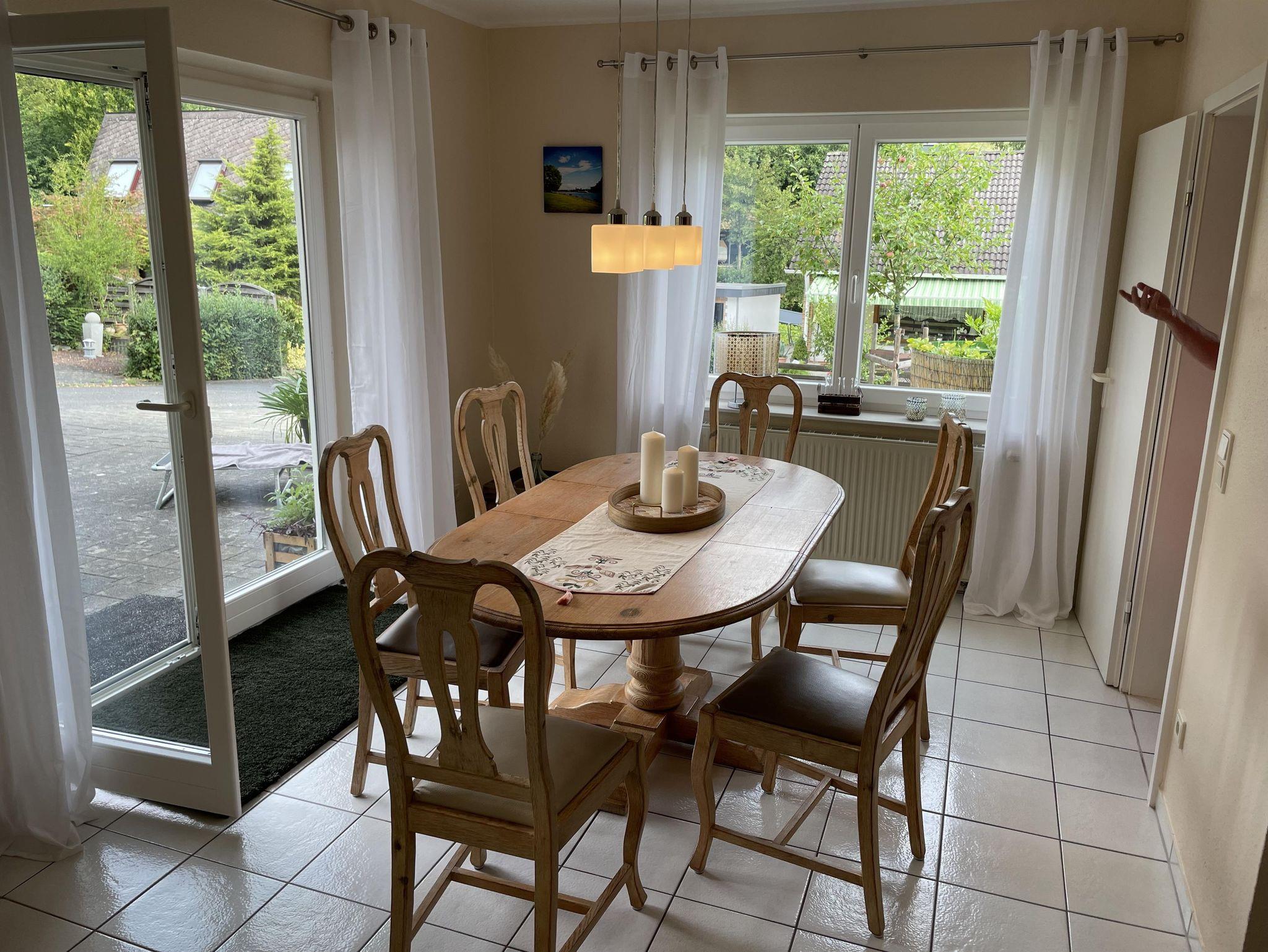 Die Wohnung mit 5 Zimmern verfügt über einen separaten Eingang. Vom Flur aus erreicht man das Bad mit ebenerdiger Dusche und WC. Zur anderen Seite liegt die voll ausgestattete moderne Küche. Im Flur befindet sich ein großer Kleiderschrank. Im Schlafzimmer erwartet die Gäste ein BoxSpring Bett. Das kombinierte Wohn/Esszimmer hat einen Anschluss an die Terrasse. Genießen Sie die Abendsonne auf den Gartenmöbeln.