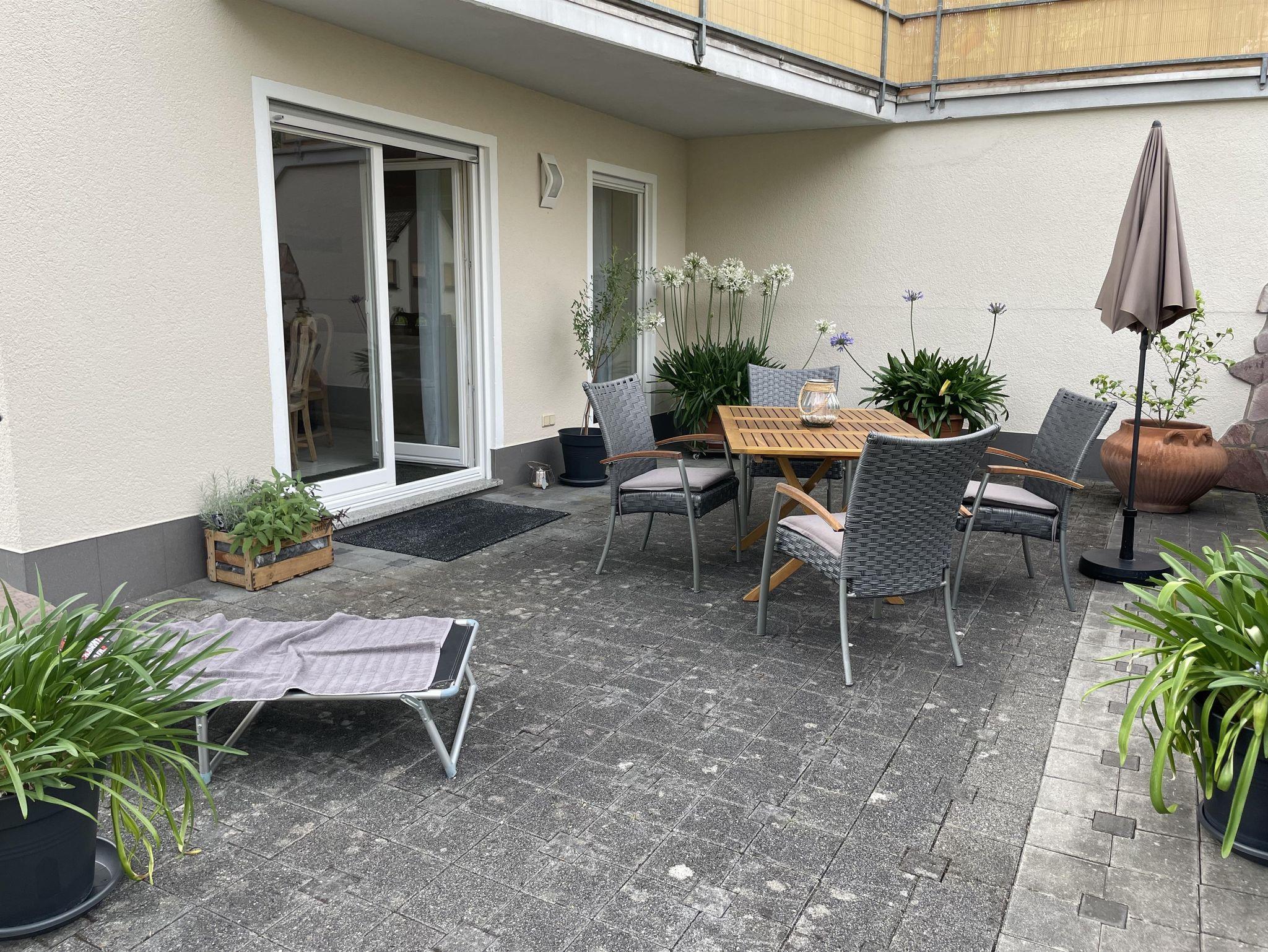 Terrasse: Gartenmöbel für 4 Personen, Sonnenliege, Sonnenschirm