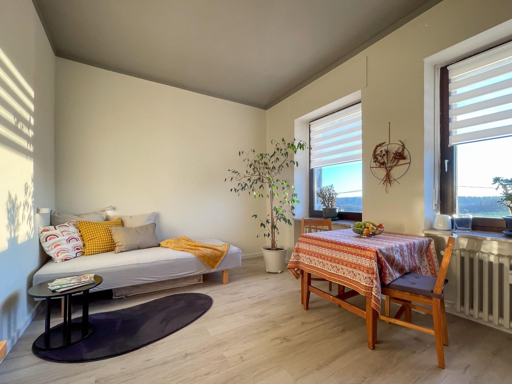 Der Wohnbereich ist harmonisch ins Schlafzimmer integriert. Sofa und Sessel laden zum Verweilen ein. Durch die offene Gestaltung bleibt alles lichtdurchflutet und einladend. Vom angrenzenden Balkon blicken Sie in die Natur.