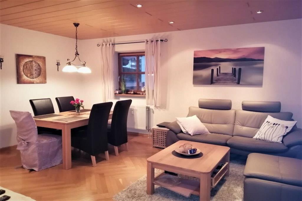 Die ebenerdige südlich gelegene komfortable Ferienwohnung mit traumhaftem Balkonblick auf Hauzenberg und Umgebung, mit hauseigenem Hallenbad, Sauna und Freibad lassen keine Wünsche übrig. Parkplatz vor dem Haus, Grillmöglichkeit, Spielplatz (ideal für Kinder) stehen zur Verfügung. Die Wohnung ist für 4 Personen mit vollwertigen Betten ausgestattet, für ein Kleinkind kann ein Kinderreisebett und Kinderstuhl bereitgestellt werden. Geräumiges Wohnzimmer mit Essbereich und Sitzecke, Doppelbett (Schrankbett), Fernseher, sowie WLAN, weiteres Schlafzimmer, für 2 Personen, eine moderne volleingerichtete Küche mit Geschirrspüler, Backofen, Kühlschrank mit separater Gefrierkombination und vielem mehr, modernes Bad mit Dusche und Toilette, Für 4 Pers. steht Bettwäsche z. Verfügung, ebenso sind pro/Pers. 2 Handtücher verfügbar (für Schwimmbad, Sauna u. Liege bitte eigene Handtücher mitbringen).