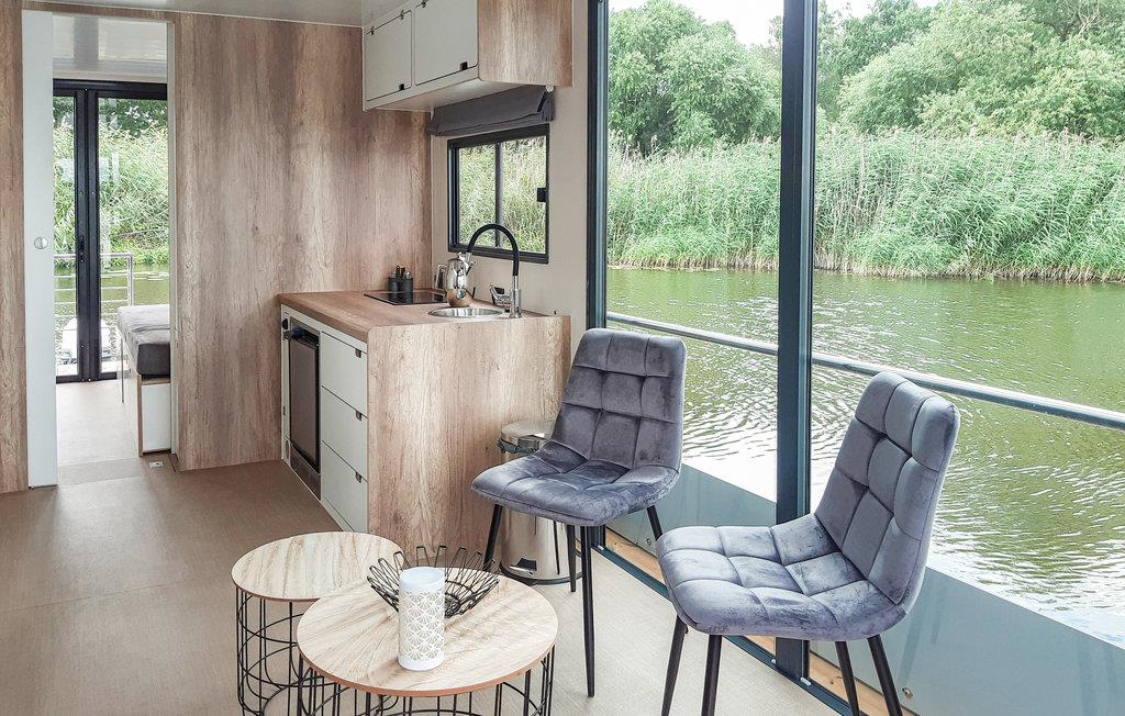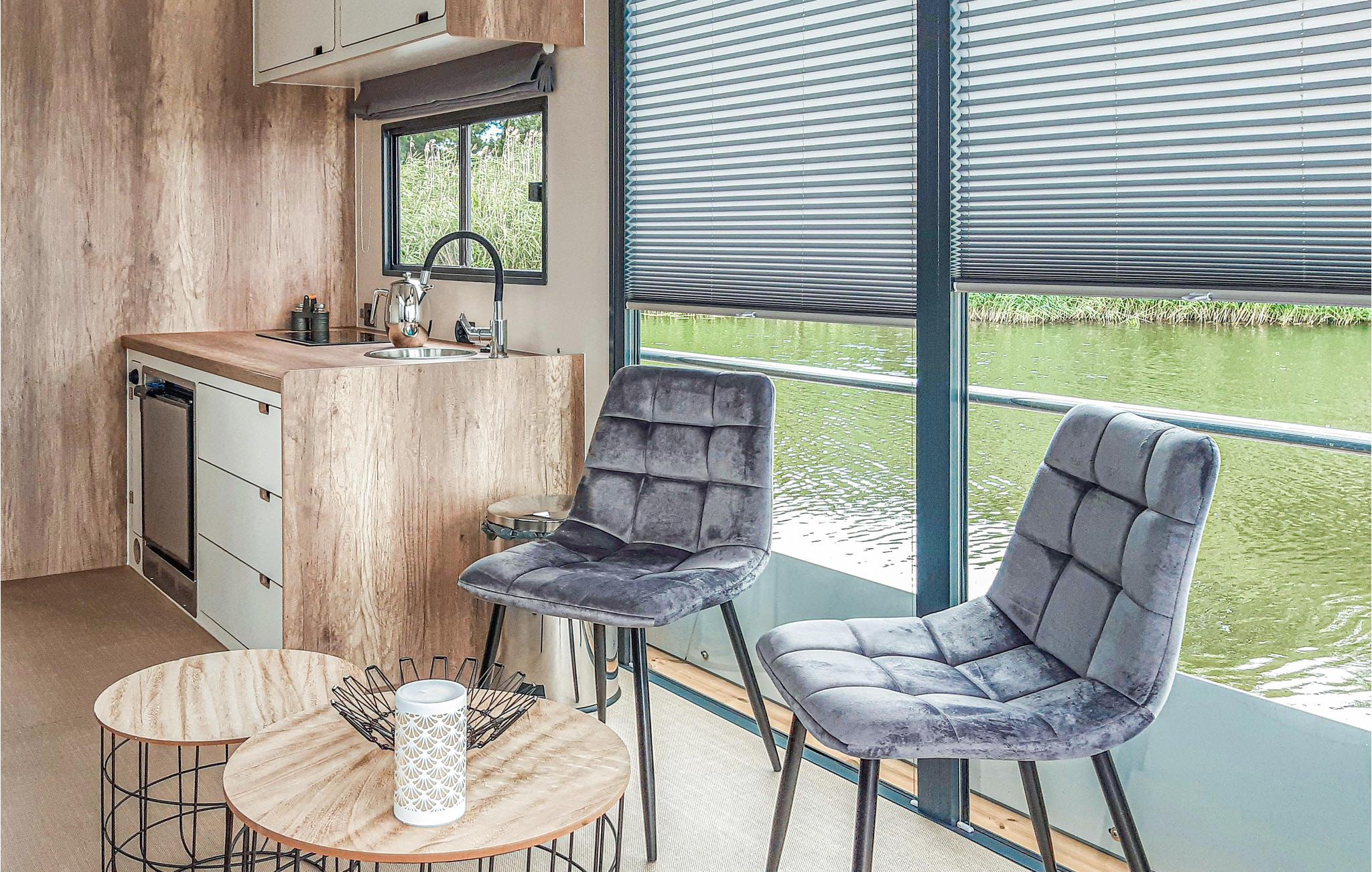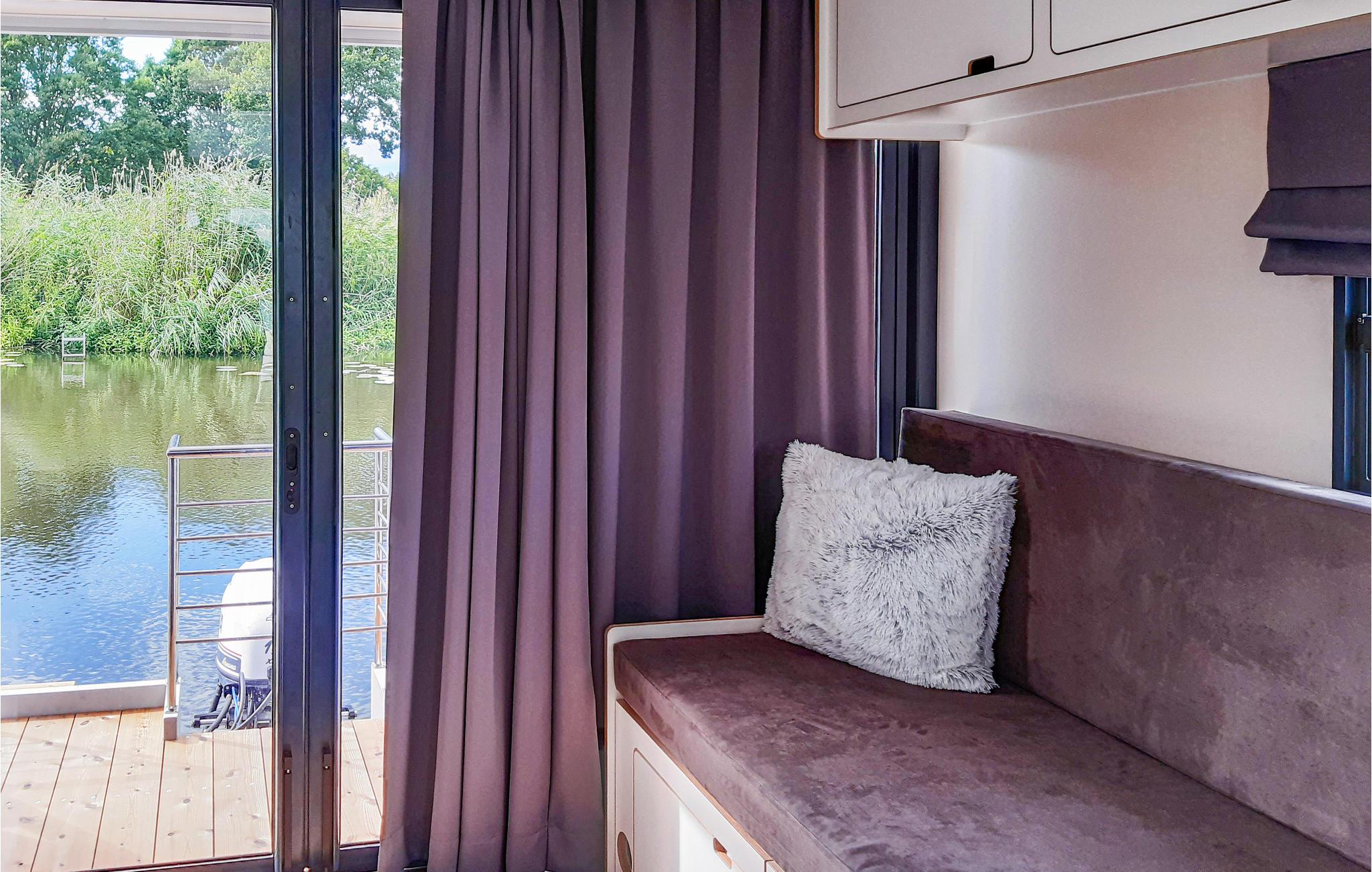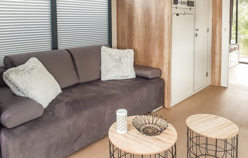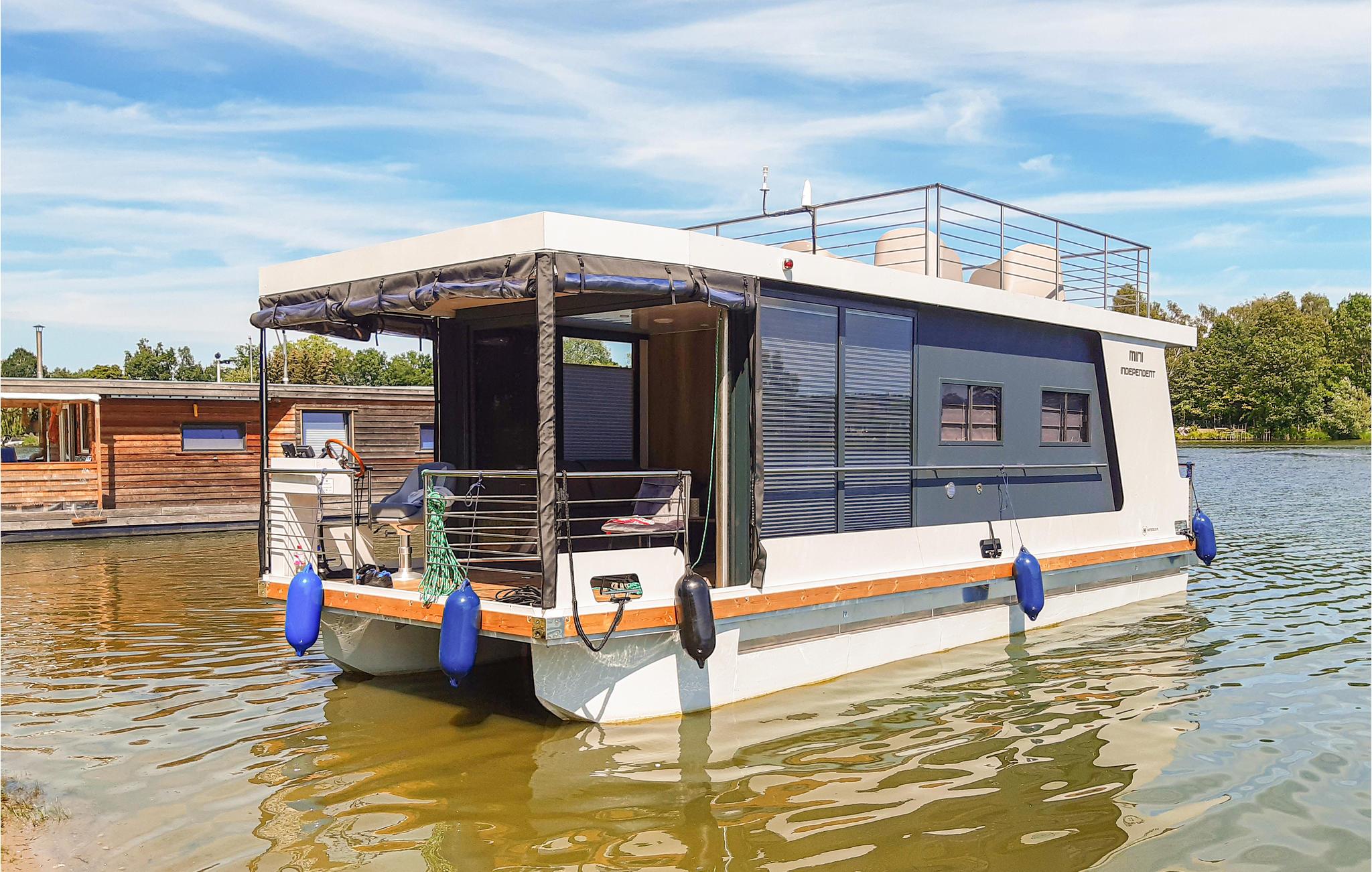 Husbåden kan rumme op til 4 personer. Den er udstyret med en konvertibel sovekabine, toilet/vask, bruser, minikøkken med køleskab, kogeplader, udtrækssofa i stuen, Bluetooth-radio og møbleret tagterrasse. Nyd udsigten til vandet fra den øverste eller den forreste terrasse. Her kan I koble af, nyde solen eller dele måltider. Store skydedøre i stævnen og i agterenden giver uendelig frihed på vandet.