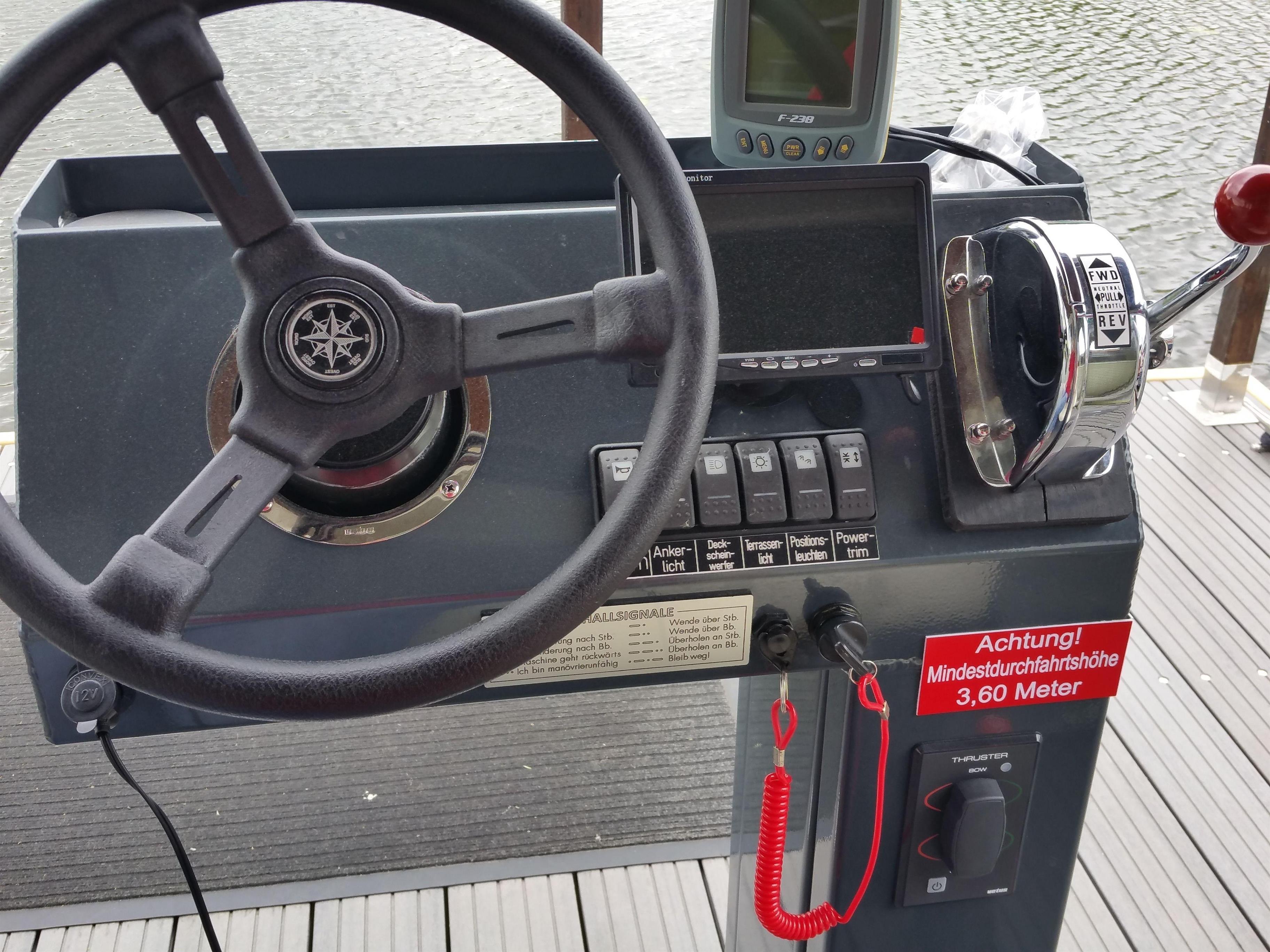 Für die Mobilität sorgen ein leistungsfähiger 25 PS Schubmotor sowie ein Bug- und Heckstrahlruder.