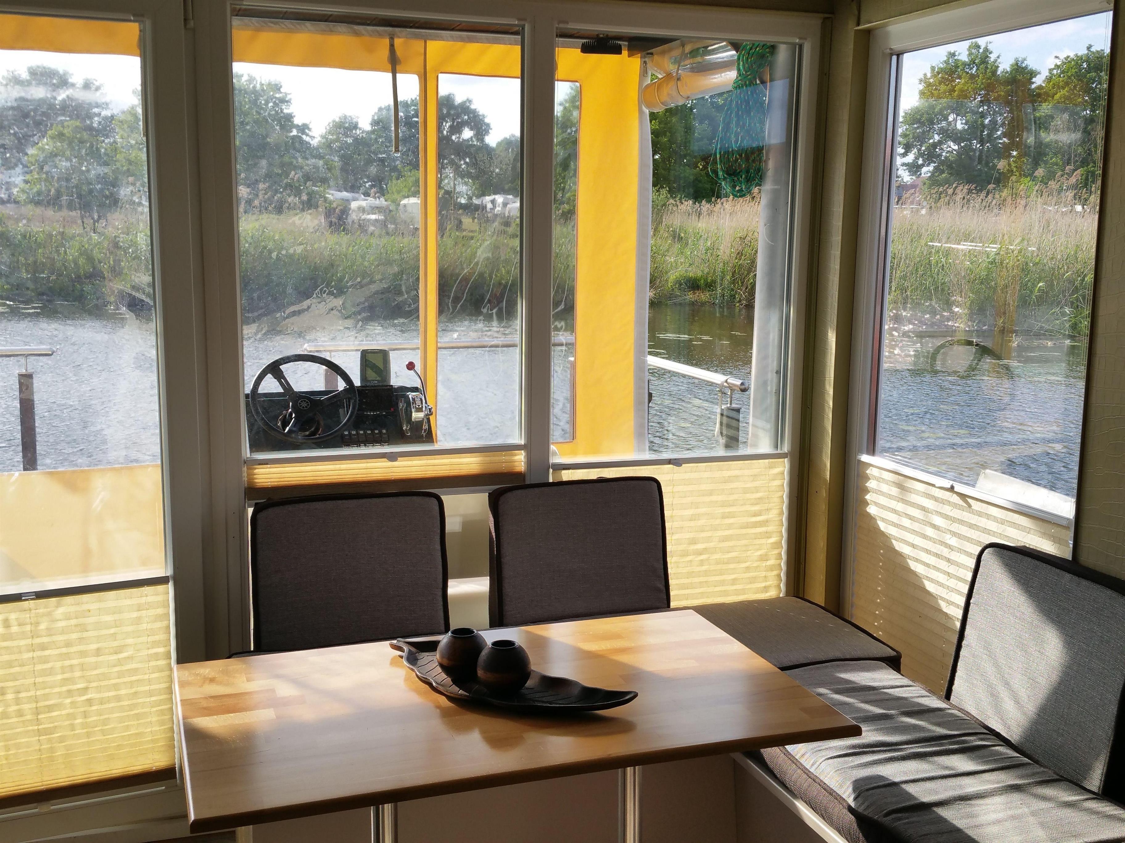 Auf dem Hausboot können bis zu 4 Personen unterkommen. Es ist vollständig ausgestattet mit 2 Schlafkabinen, Toilette/ Waschbecken, separater Dusche, Küchenzeile mit Kühl-Gefrierkombi, Gasherd und Backofen, Sitzgruppe, Satelliten-Fernsehen und CD-Radio sowie Klimaanlage. Genießen Sie den Blick auf das Wasser von der Terrasse aus. Hier können Sie abschalten, die Sonne genießen oder gemeinsame Mahlzeiten einnehmen.