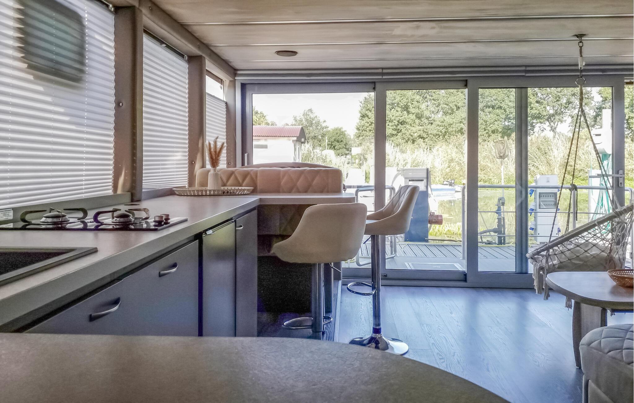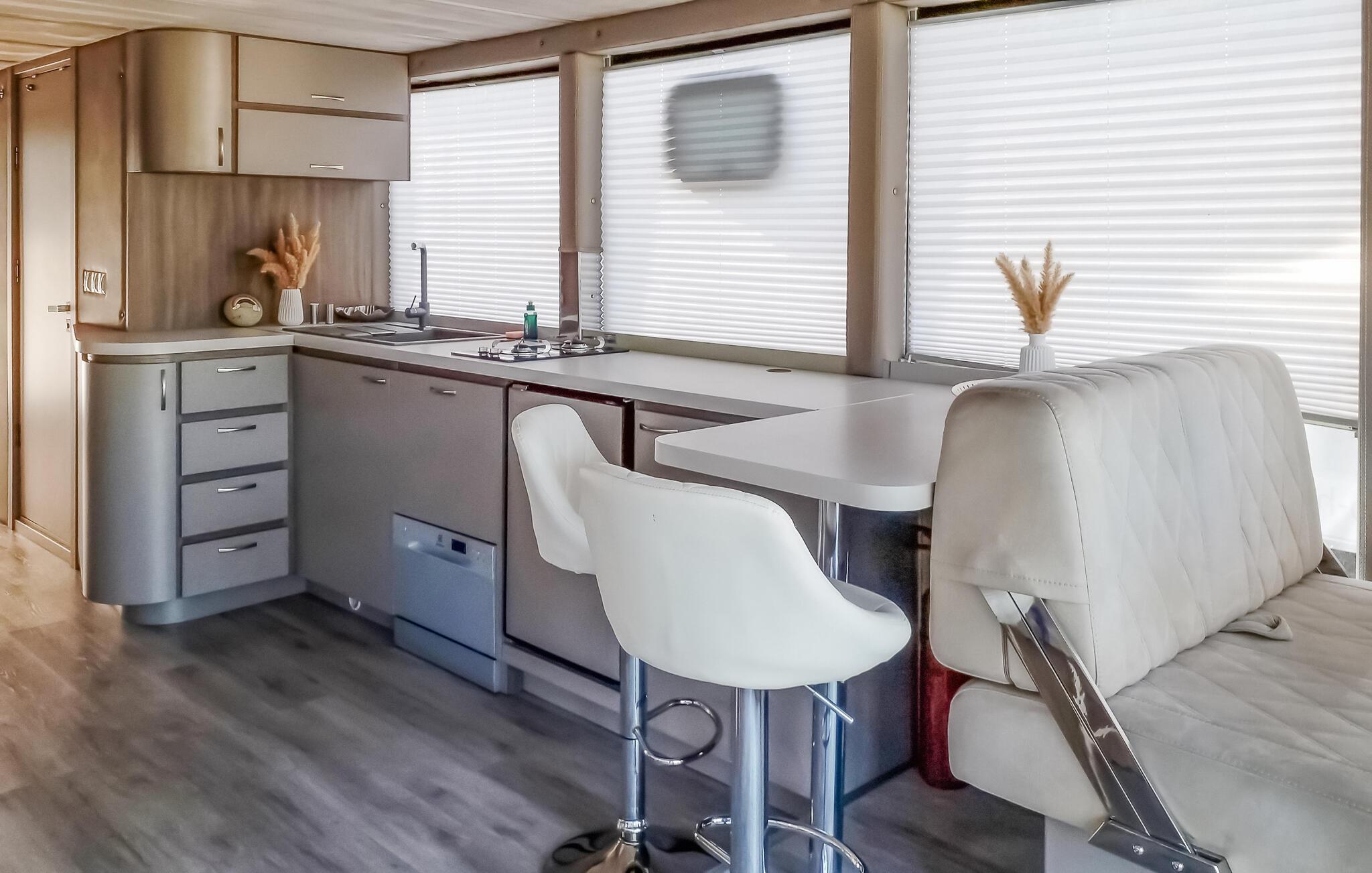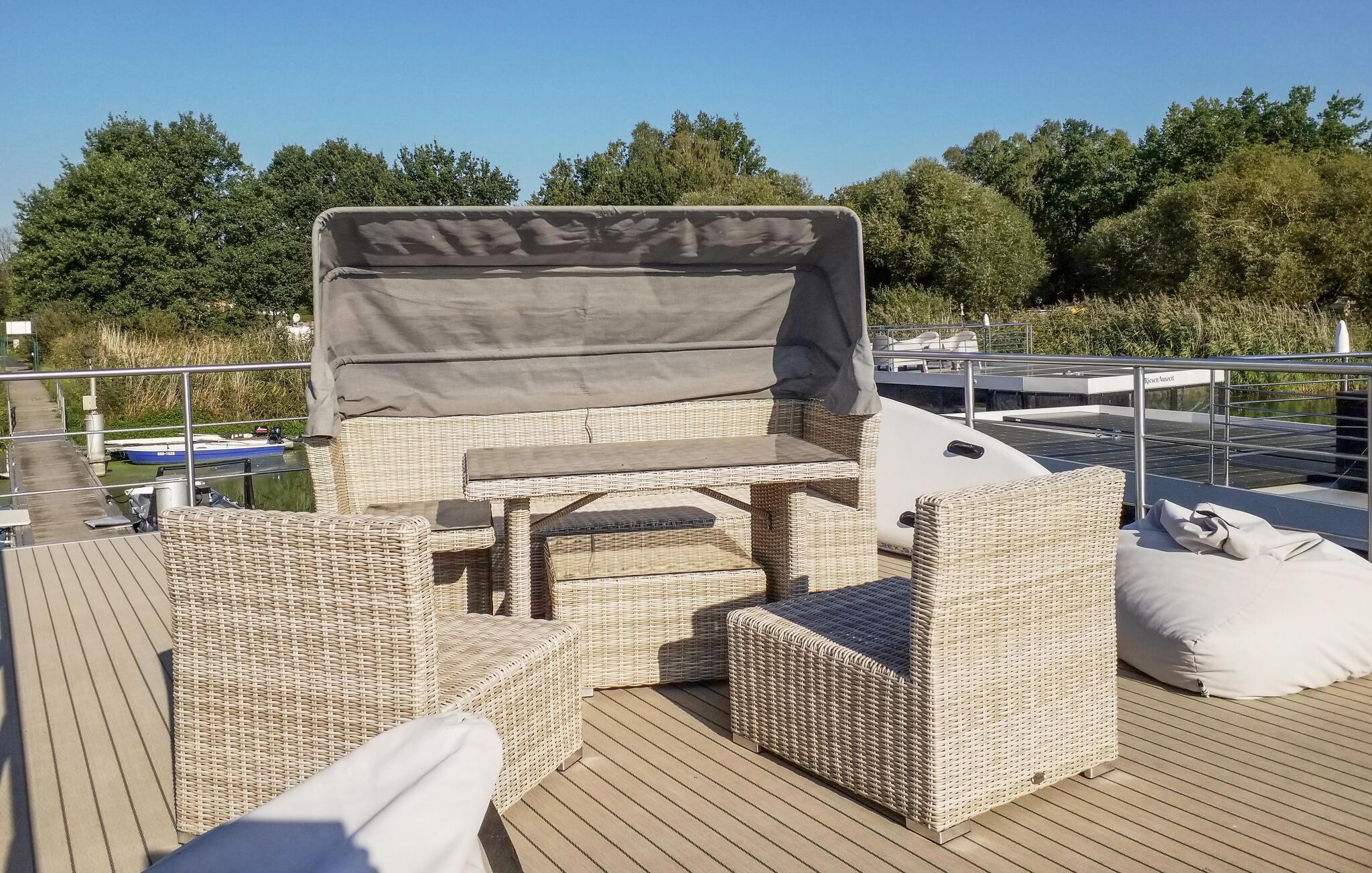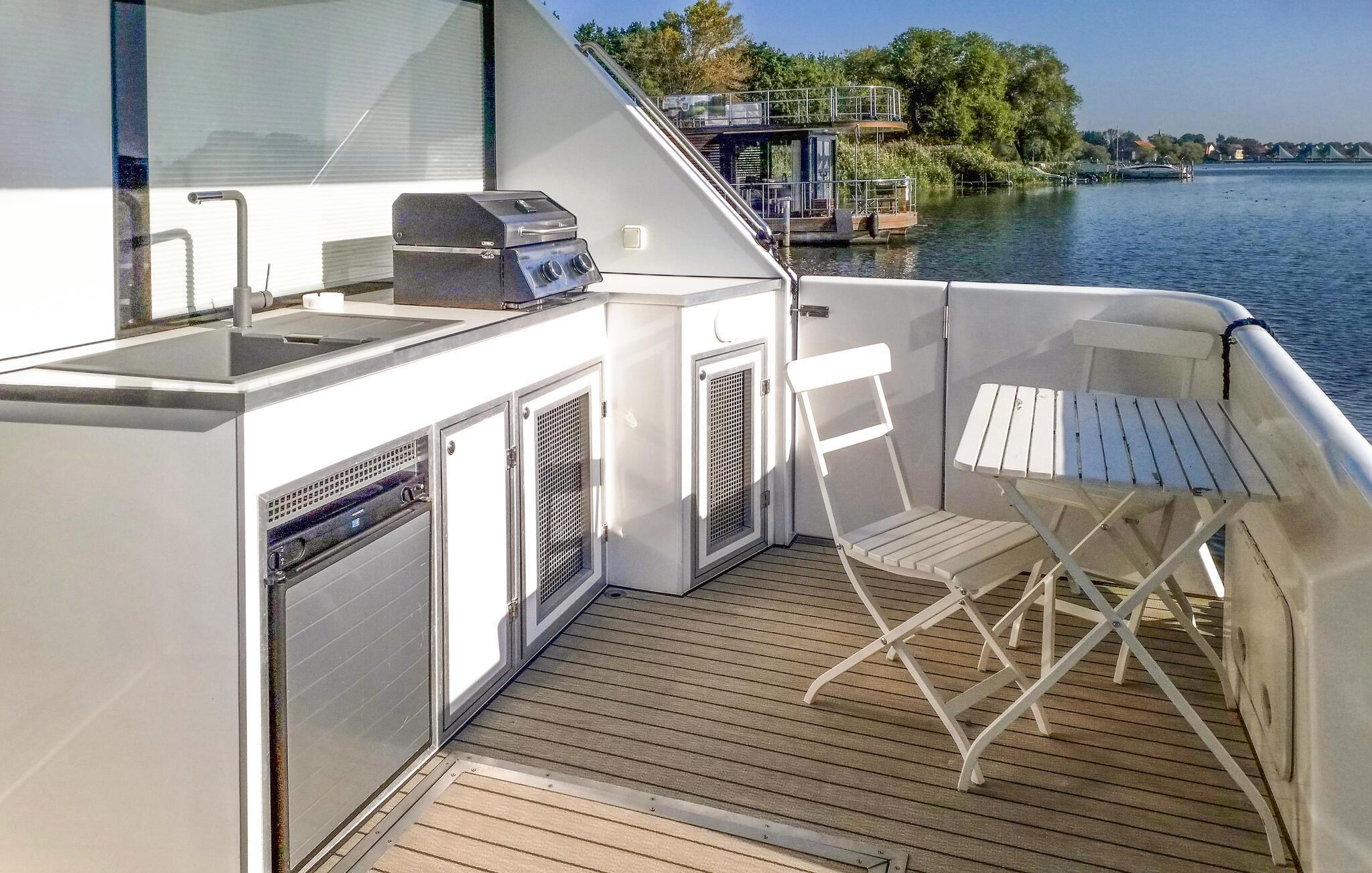 Oplev en unik ferie på denne charmerende husbåd ved Havelsee. Den moderne, lyse indretning skaber en indbydende atmosfære, hvor I straks vil føle jer hjemme. Slap af på terrasserne, eller beundr udsigten gennem de store vinduer, mens I nyder roen på vandet. Den åbne opholdsstue giver en luftig og hyggelig stemning, og det fuldt udstyrede køkken har alt, hvad I behøver under jeres ophold. Udendørs kan I vælge mellem terrassen med udendørs køkken og grill eller den store tagterrasse, der indbyder til solbadning og hyggelige stunder.