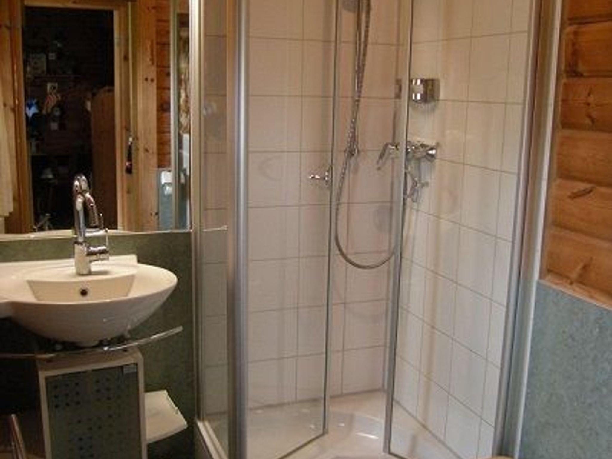 Modernes Duschbad, überdachte, windgeschützte Südwest-Terrasse mit Markise (extrem hoher UV-Schutz), möbliert mit Holzbänken und Tisch, zusätzlich mit zwei Deckchairs und zwei Hochlehnern (jeweils mit Polsterauflagen). Im Abstellraum befinden sich ergänzend zwei Stoff-Faltliegen und ein Sonnenschirm; neben dem Hauseingang steht eine kleine Bank.