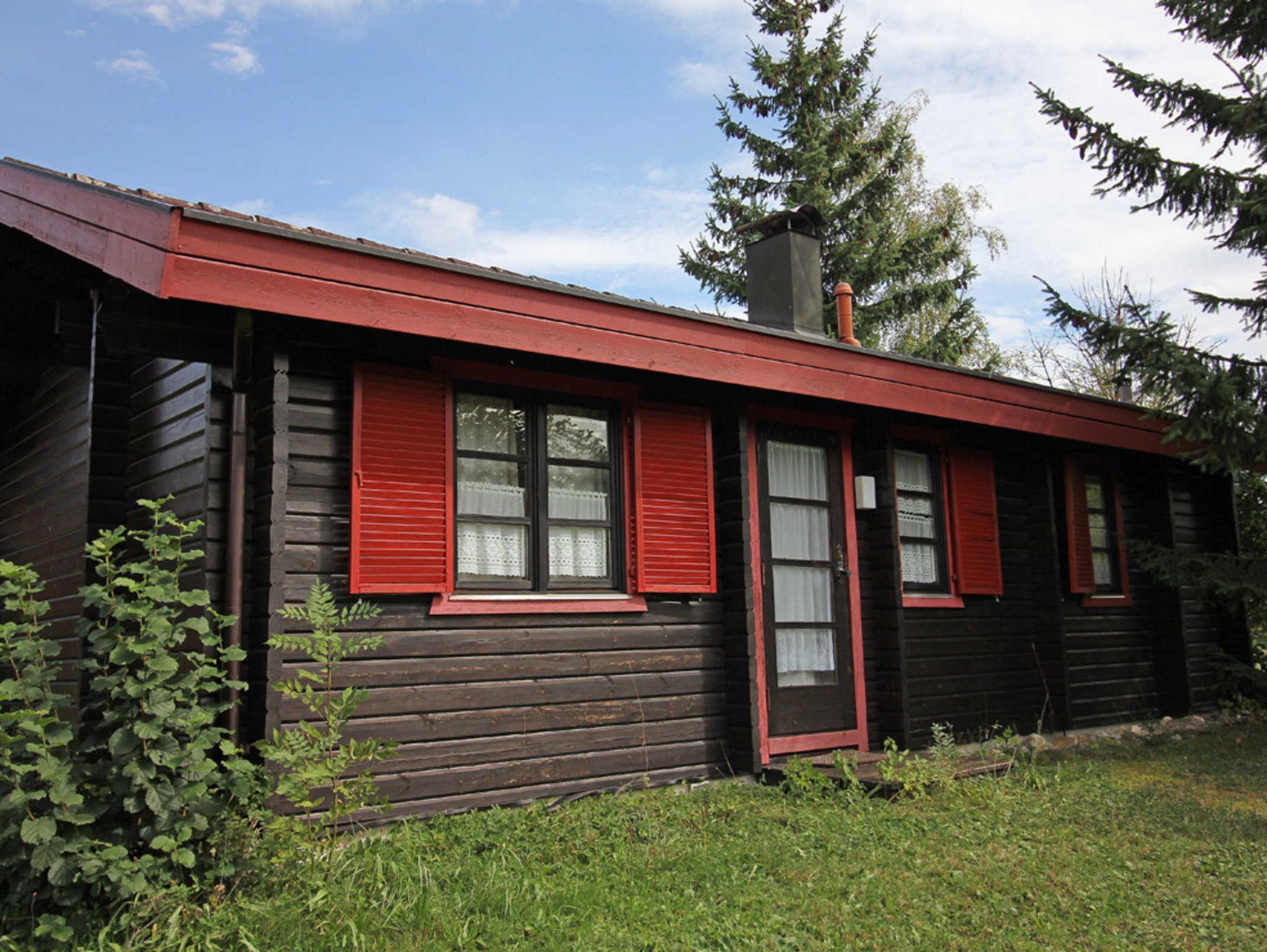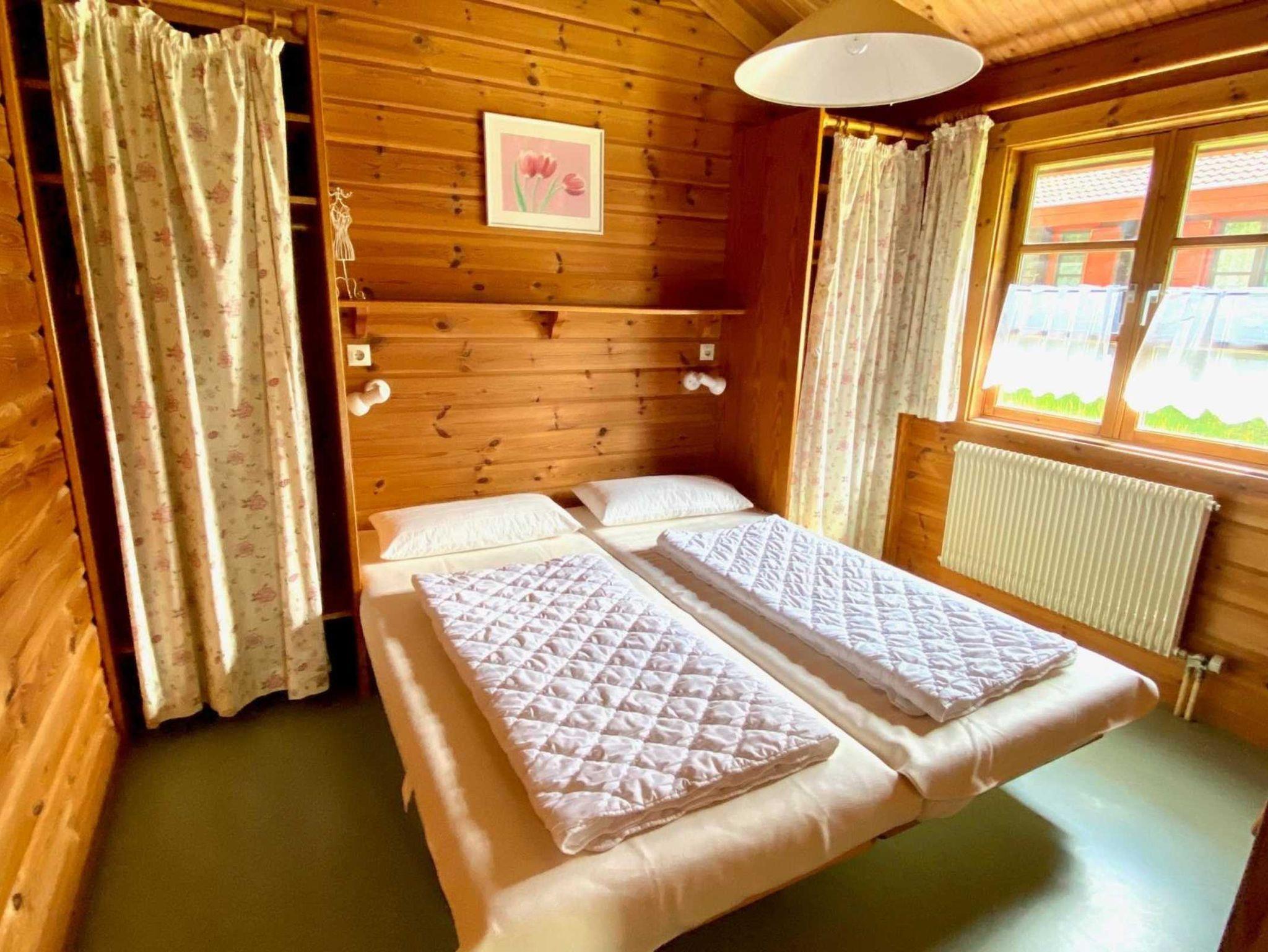 Sie wohnen in einem 3-Zimmer-Ferienhaus für bis zu 4 Personen auf 45 m² Wohnfläche, ein Schlafzimmer mit Doppelbett, ein Schlafzimmer mit Etagenbett, Wohnraum mit Kaminofen, Bücher zum Schmökern, separater Essplatz, voll ausgestatteter Küchenbereich, Diele mit Garderobe, Dusche/WC, Terrasse, SAT-Farb-TV mit Empfang Premiere Film, Premiere 1 + 2 und Disney Channel. Spiele für drinnen und draussen. Autostellplatz am Rande der Anlage.
