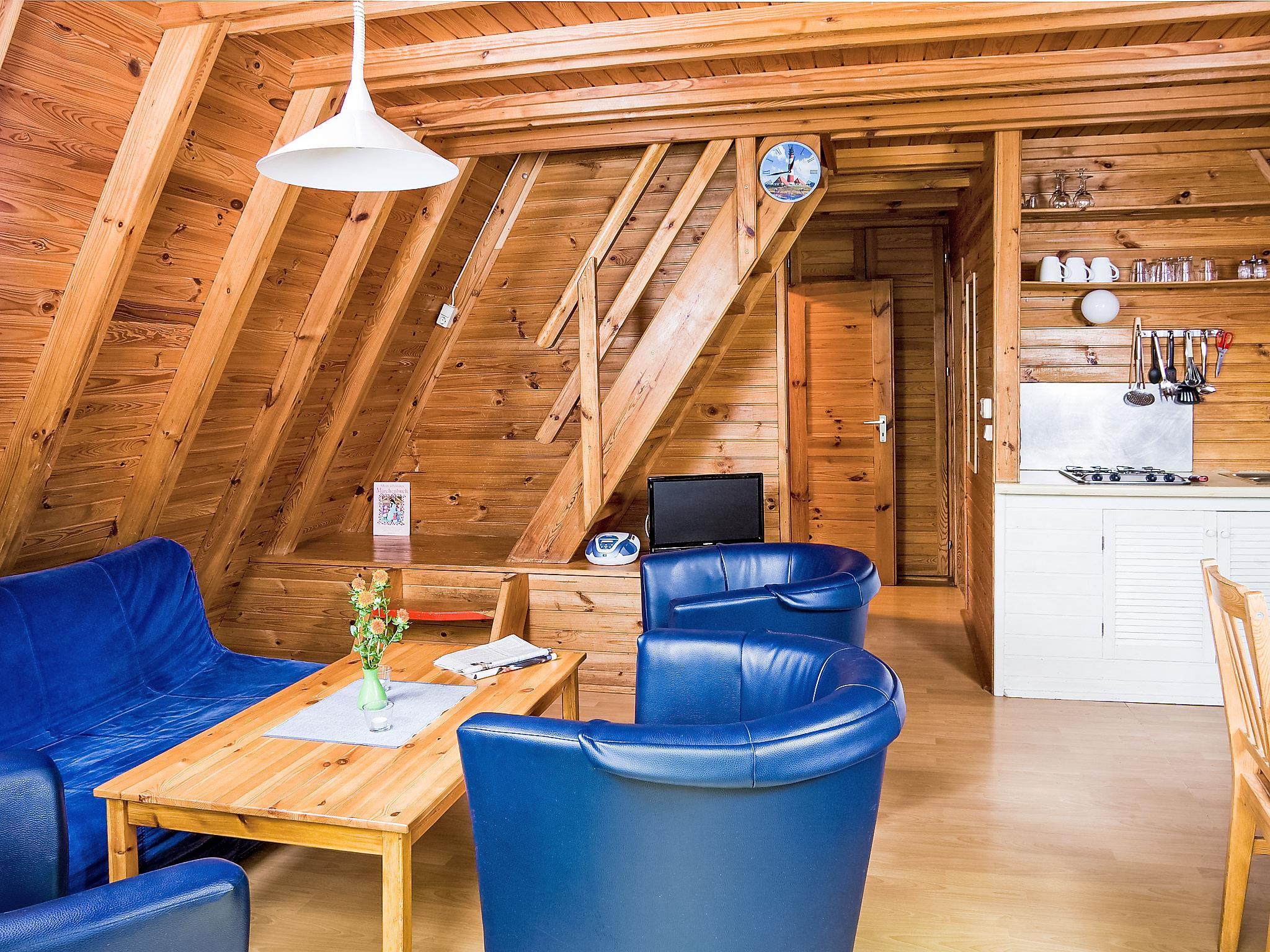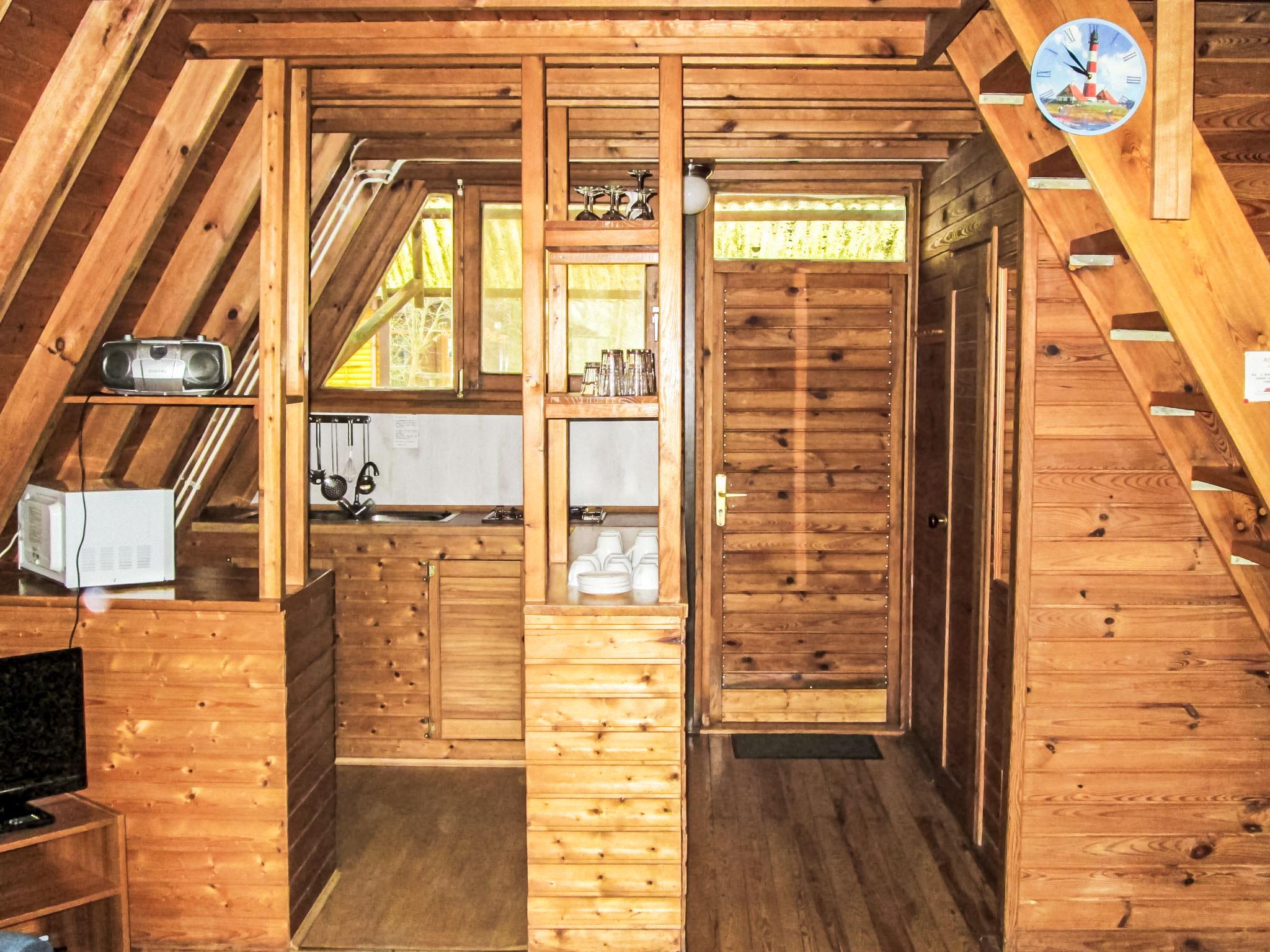 3-room house 50 m2 on 2 levels, on the ground floor. Simple furnishings: living/dining room with sloping ceilings with satellite TV and radio. Small kitchenette (3 hot plates, electric coffee machine). Shower/WC. Upper floor: (steep stair), 2 rooms with sloping ceilings, each room with 2 beds. Gas heating. Terrace roofed. Terrace furniture. Facilities: children's high chair (extra). Internet (WiFi, free). Parking at the house. Please note: non-smoking house. Maximum 2 pets/ dogs allowed. Smoke alarm. House constructed in timber, access to the top floor via a narrow staircase.