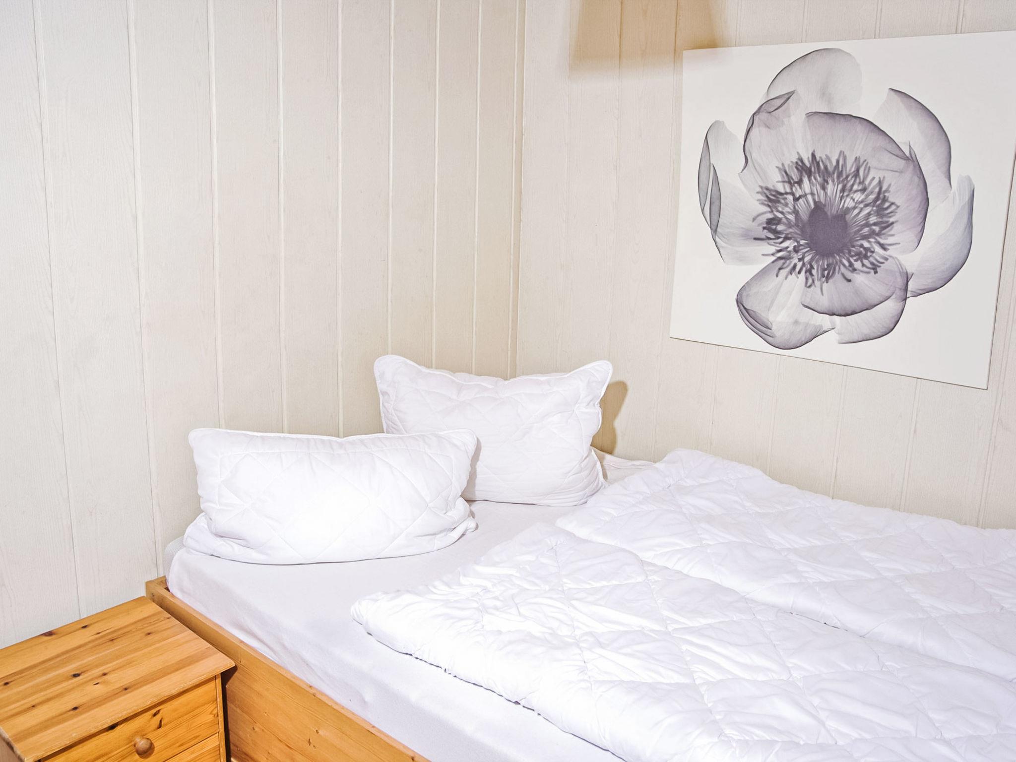 3-room house 30 m2, on the ground floor. Simple furnishings: living/dining room with satellite TV and radio. 1 children's room with 1 x 2 bunk beds. 1 room with 1 double bed (2 x 80 cm, length 200 cm). Small kitchenette (3 hot plates, electric coffee machine). Shower/WC. Gas heating. Terrace roofed. Terrace furniture. Facilities: children's high chair (extra). Internet (WiFi, free). Parking at the house. Please note: non-smoking house. Maximum 2 pets/ dogs allowed. Smoke alarm. The wooden holiday house has a lawn for shared use. DE 151 378 359