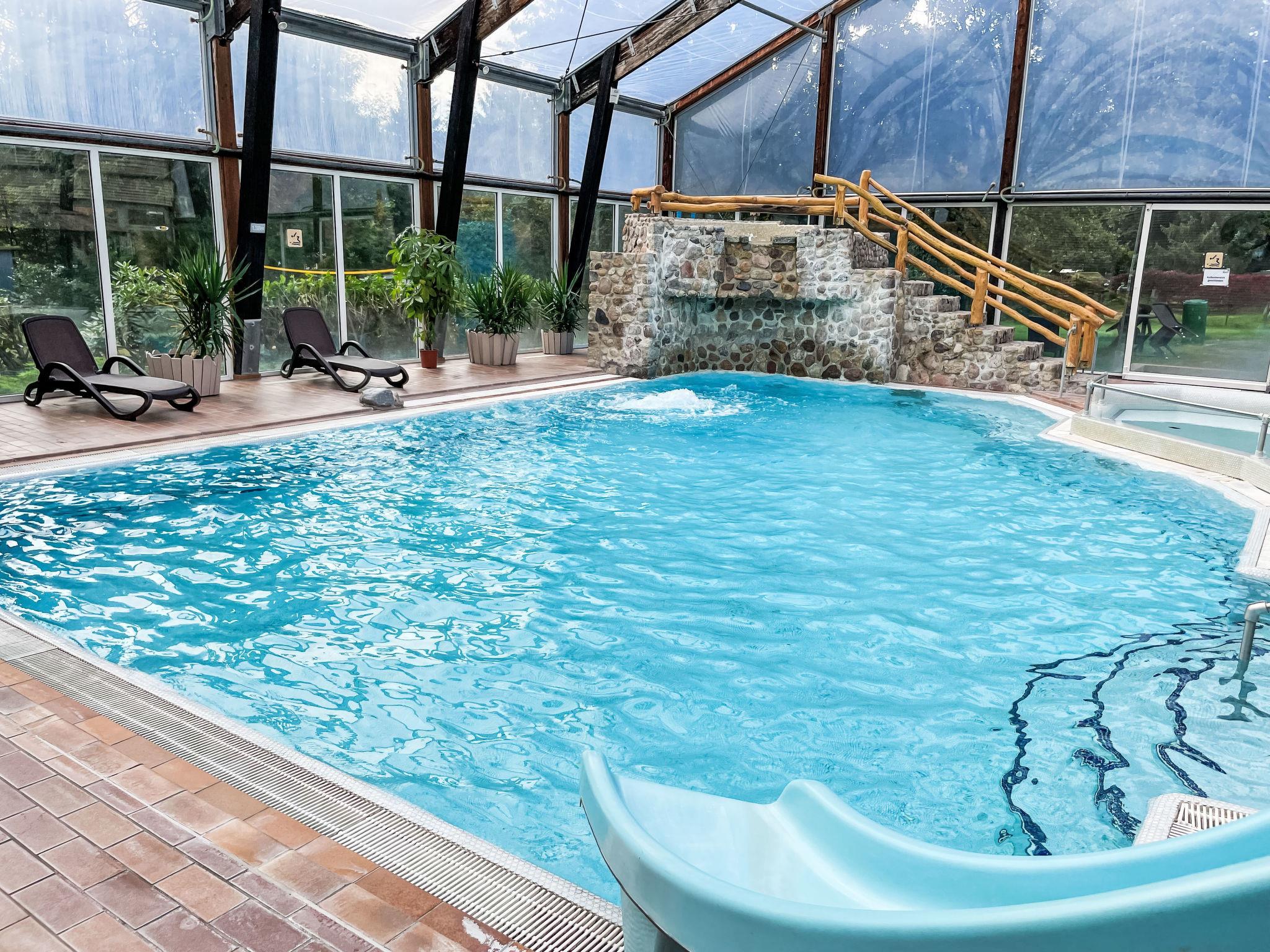 Klint 5 km from Hechthausen: Riding stables and child friendly resort "Geesthof". Outside the resort, 5 km from the centre of Hechthausen, in a quiet position, 100 m from the lake, directly by the river, in the woods. For shared use: indoor pool (15 x 10 m, seasonal availability: 21.Dec. - 01.Jan. and 04.Apr. - 02.Nov.). In the complex: reception, restaurant, sauna (extra). Table tennis, washing machine (extra), tumble dryer (for shared use, extra). Supermarket 4 km, bus stop 600 m, railway station "Hechthausen" 3 km, diving center 10 km, bathing lake 100 m. Please note: car recommended. Entertainment in the season. The photograph shows a typical example. The Oste (a tributary of the Elbe with salmon stocks) runs along the edge of the holiday and camping complex. For shared use: outdoor pool (15 x 6 m), volleyball and football pitch, playgrounds, green and play areas. Riding lessons and guided rides through the adjacent forest area on request. Horse guest boxes, bicycles and go-karts can be rented for a fee. Visits to the indoor and outdoor pool areas are included in the rental price. The restaurant and swimming pool are closed in the winter season.