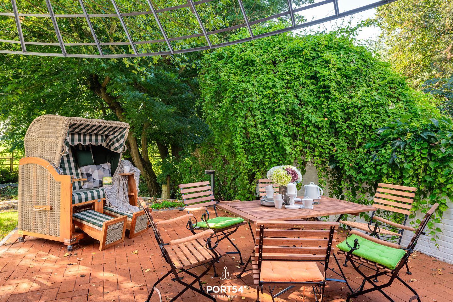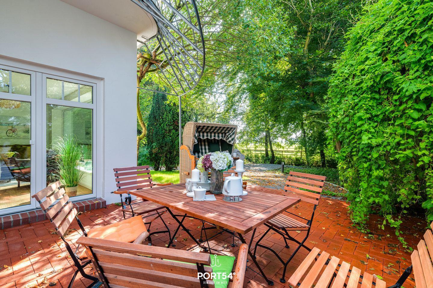 Zwei stilvolle Terrassen (Süd und Ost) mit hochwertigen Möbeln bieten den perfekten Ort, um die warmen Tage zu genießen. Ein Grill steht ebenfalls zur Verfügung. Im Strandkorb können Sie sich einfach mal zurück lehnen und die Ruhe genießen.