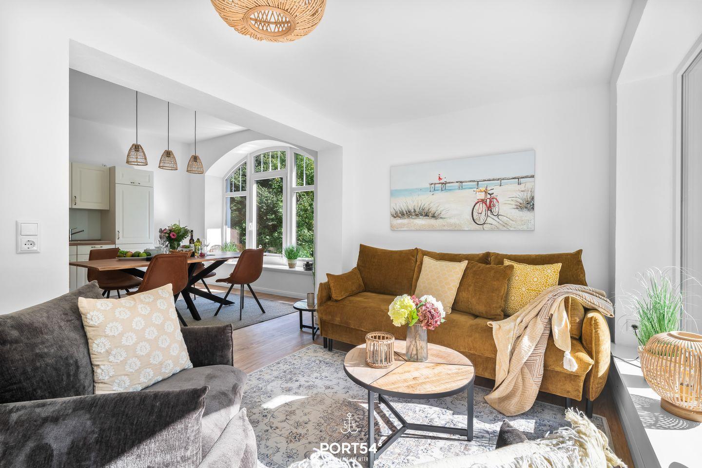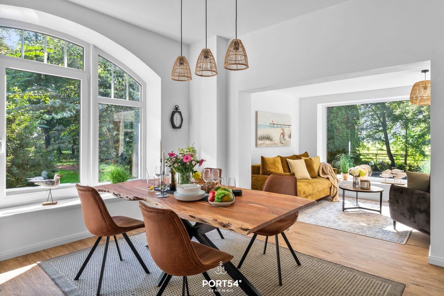 Die Wohnung besticht durch hohe Wände, stilvolle Einrichtung und besonders große Fenster mit Ausblick ins Grüne.