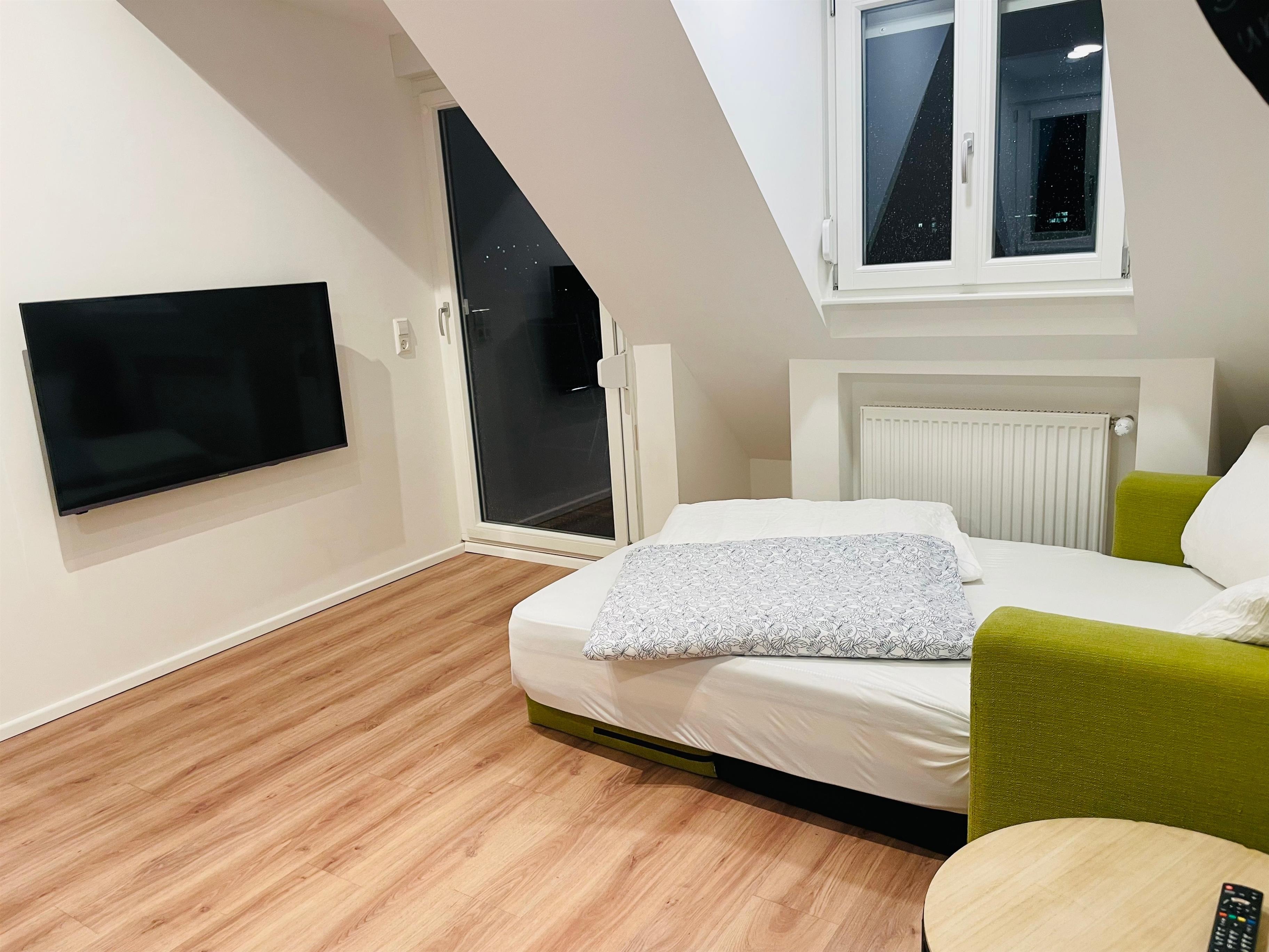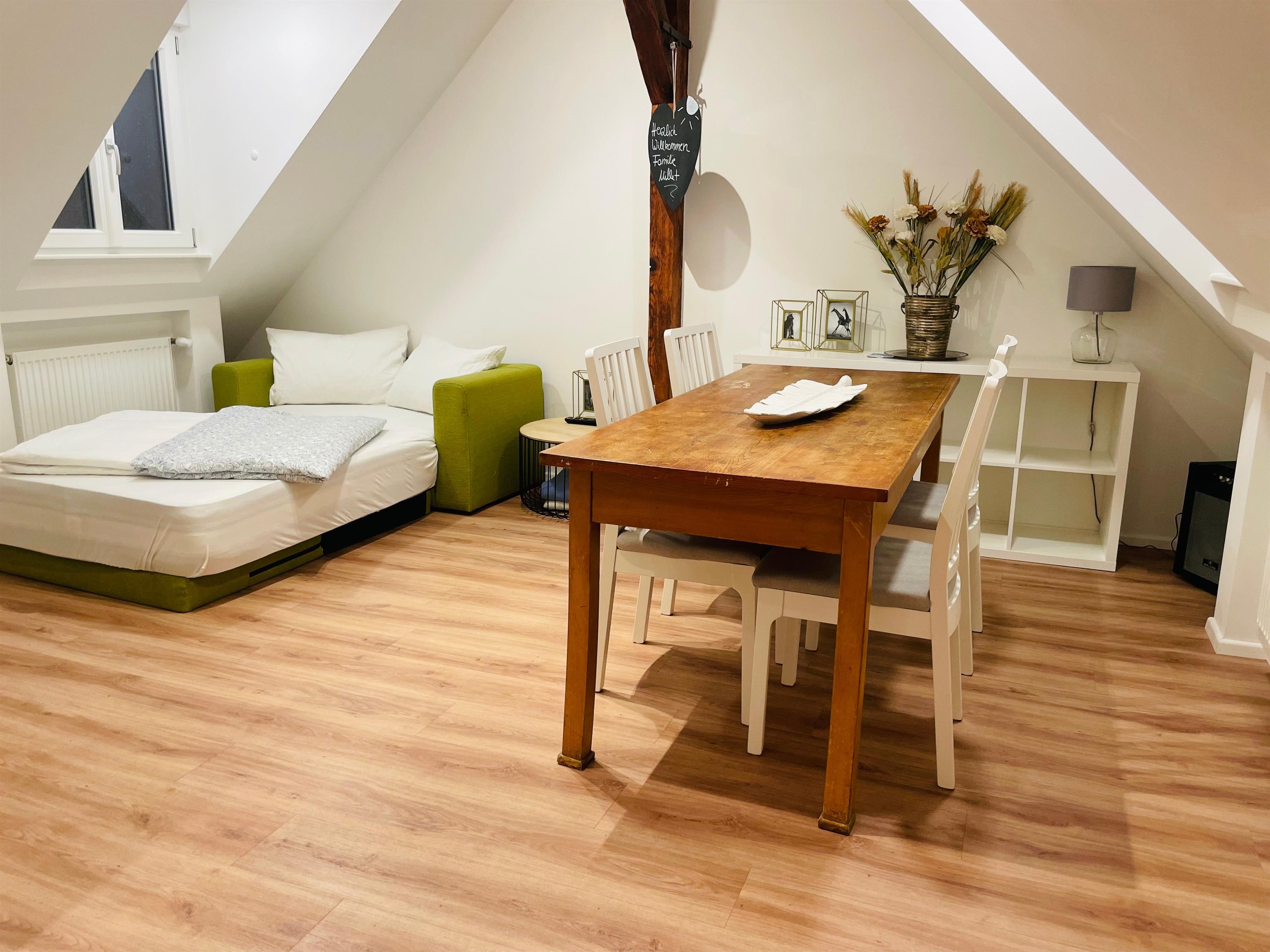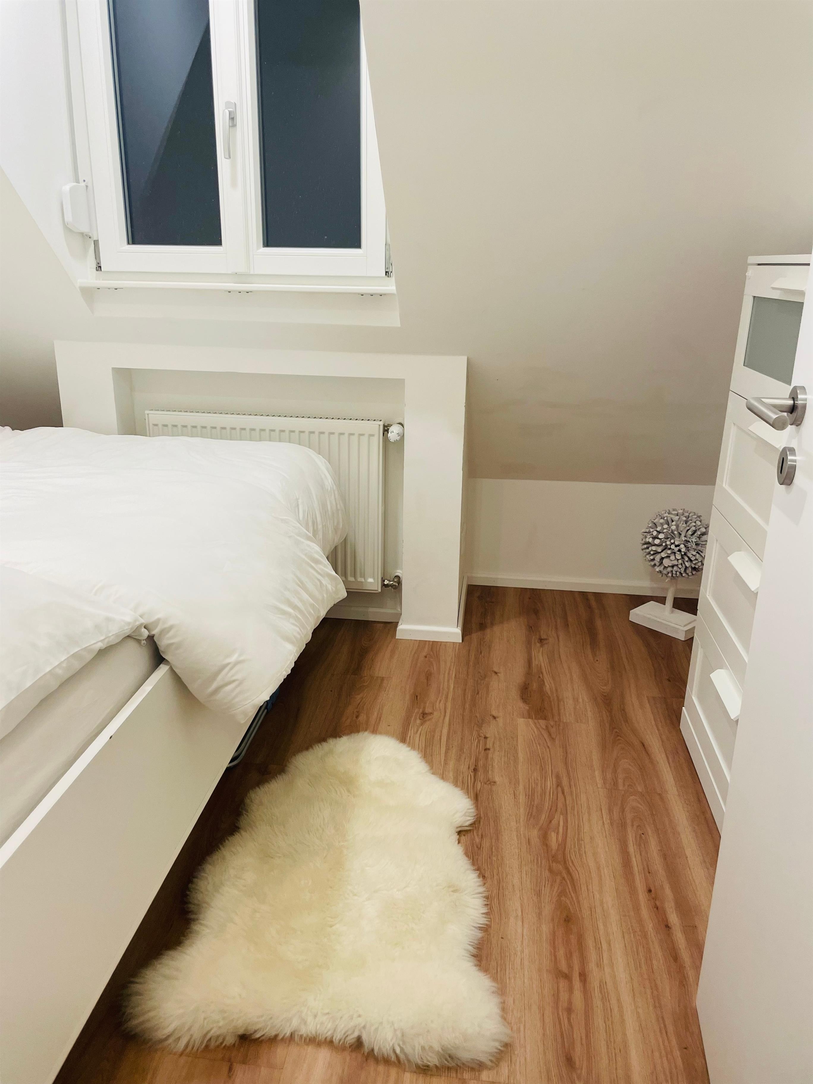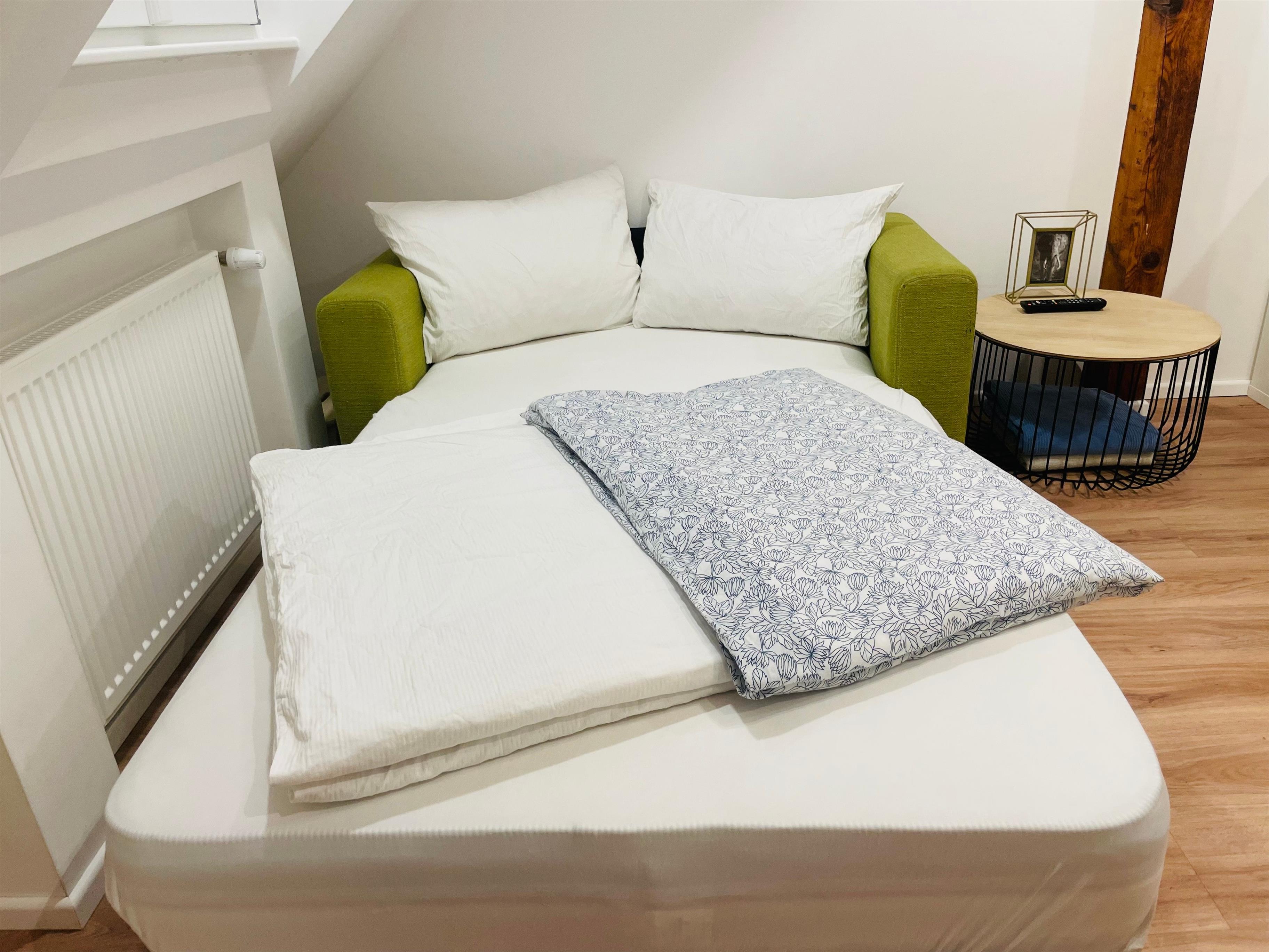 Die Schlafmöglichkeiten verteilen sich auf ein Queensizebett (1,60m) im Schlafzimmer und ein Schlafsofa mit hochwertiger Matratze (ca. 1,20m) im Wohnbereich. Bei Bedarf können ein Kinderbett, ein Kindersitz und eine weitere Matratze (90cm) zur Verfügung gestellt werden. Bettwäsche wird einmalig pro Aufenthalt gestellt.