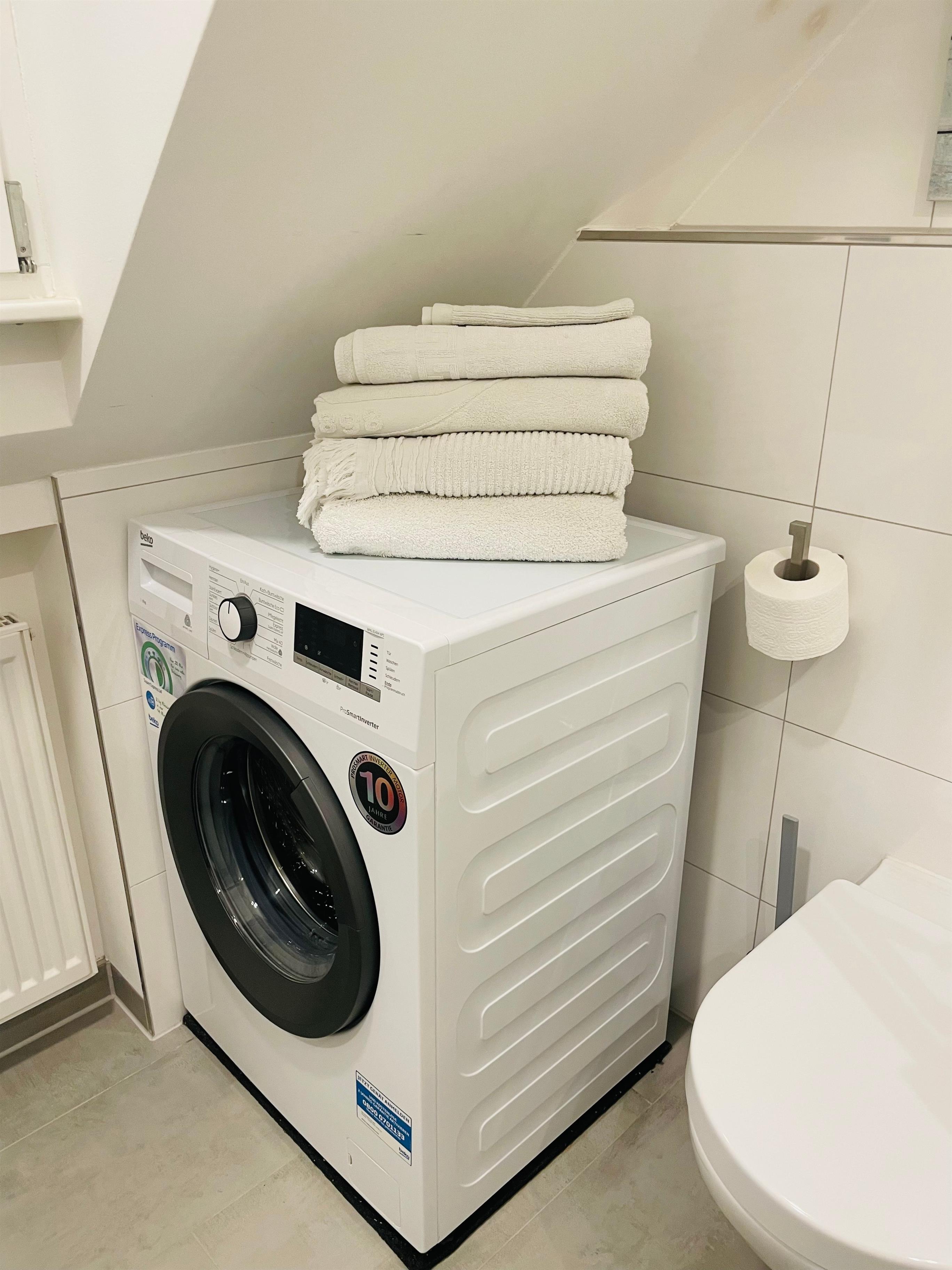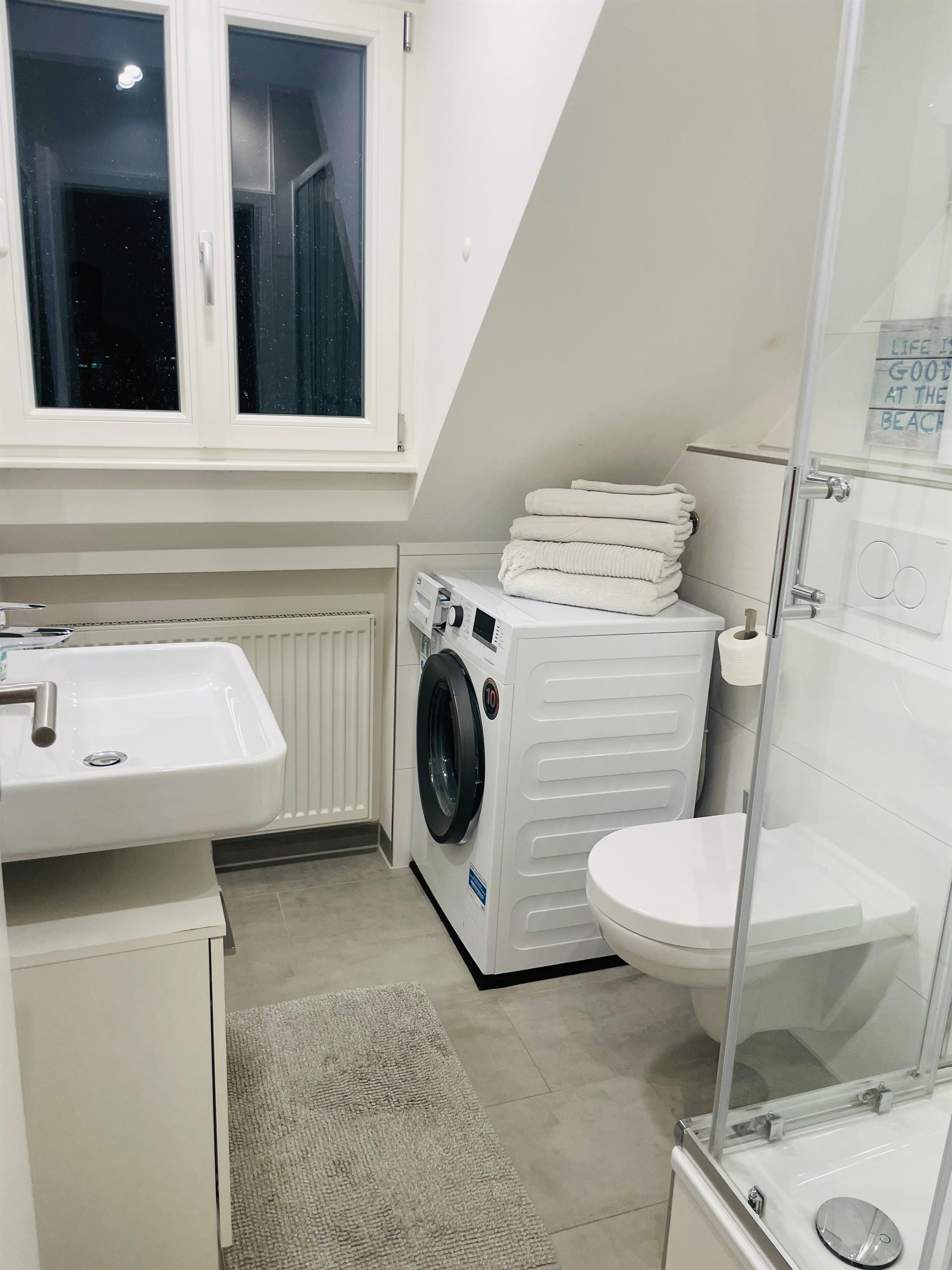 Das neue, helle und moderne Bad verfügt über verfügt über eine Dusche, ein Waschbecken sowie eine Waschmaschine.