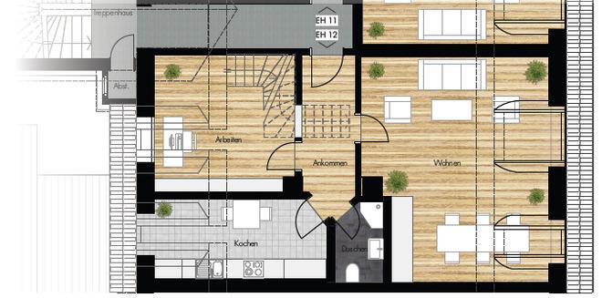 Des Weiteren erschließen sich eine geräumige Küche, ein Badezimmer und ein Durchgangszimmer (als Schlafraum mit 1,60m x 2,00m Bett) zum Treppenaufgang ins 2. Obergeschoss.