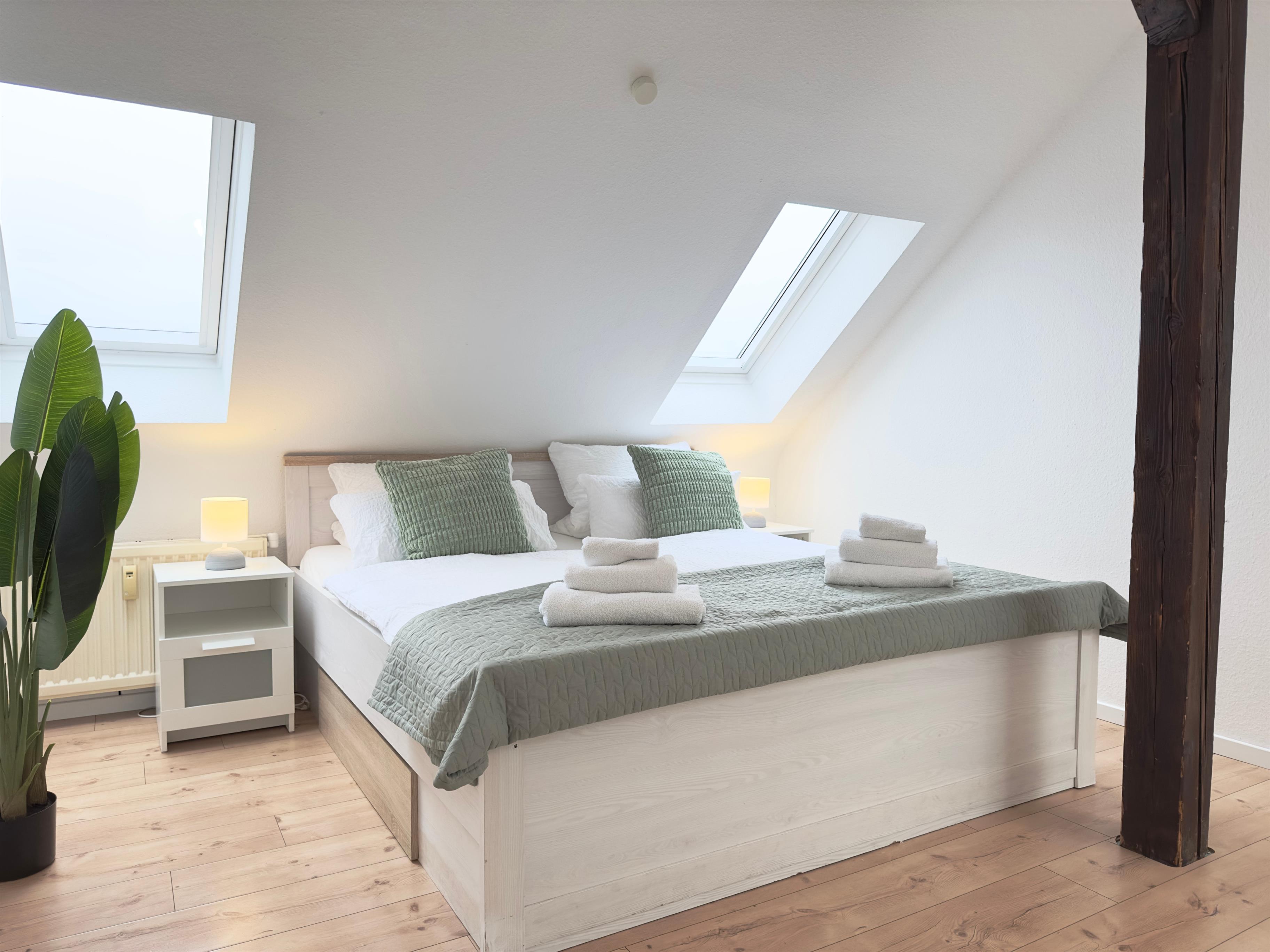 Weiterhin verfügt die Wohnung über ein zweites Badezimmer. Ein großes Schlafzimmer mit Doppelbett (1,80m), sowie ein weiteres Durchgangszimmer mit 2 Einzelbetten und kleinem Ankleidezimmer runden das 2. DG ab.