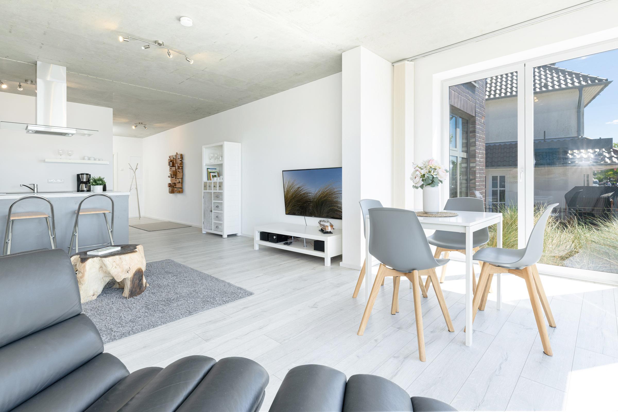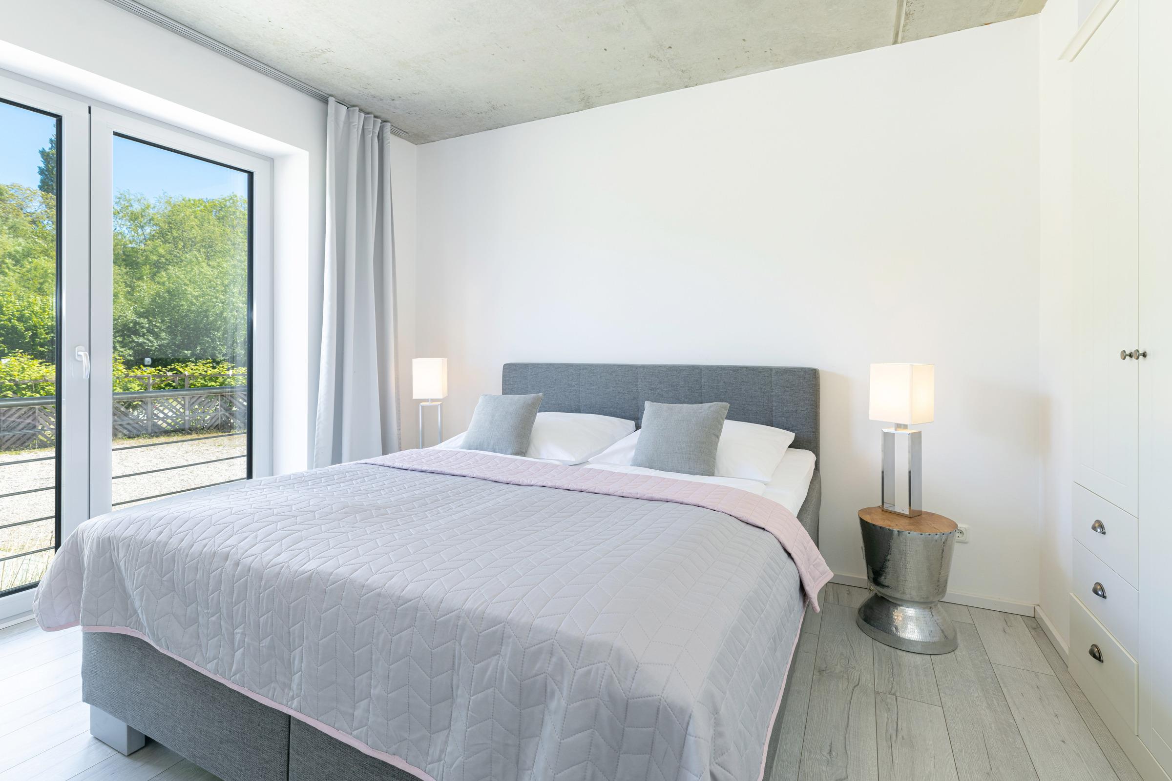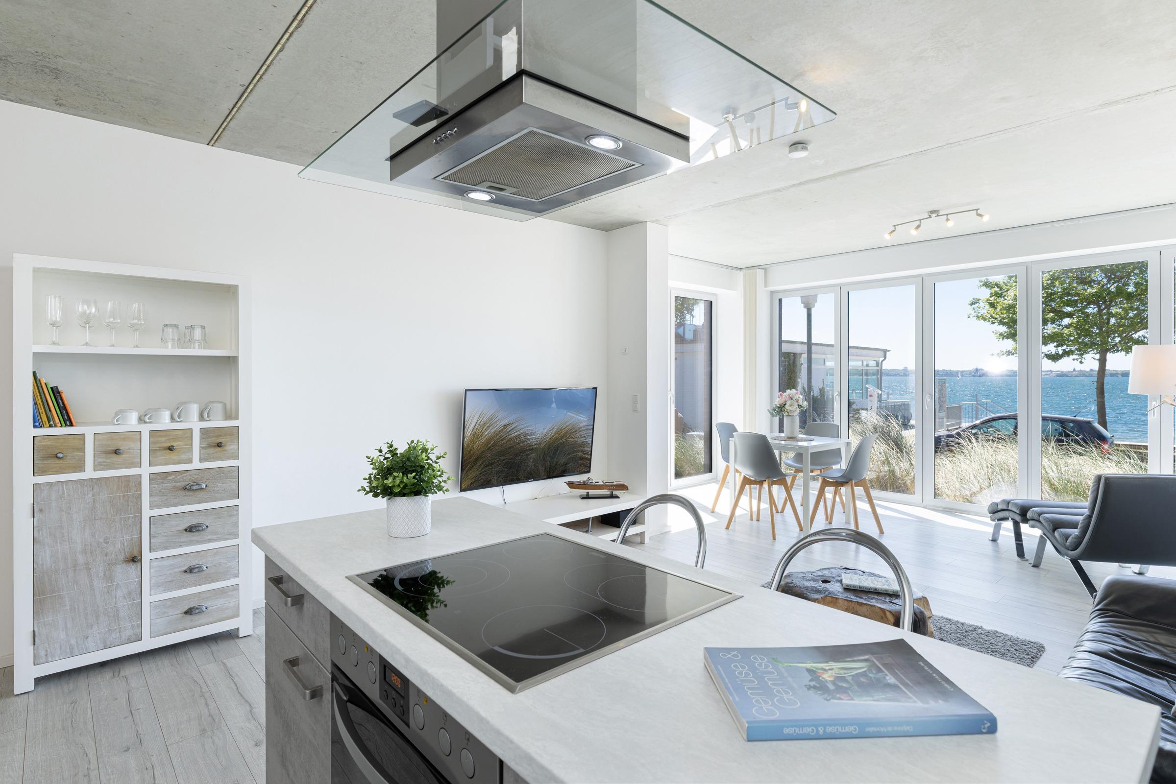 Urlaub der Extraklasse mit beeindruckendem Blick aufs Wasser. Jeder einzelne Raum besticht durch seine großzügige Aufteilung und seine verwendeten Materialien. Der kombinierte Wohnraum ist hochwertig und modern eingerichtet und verfügt über ein bequemes Sofa, Flachbildschirm-TV und eine extra Relax-Liege. Die bodentiefe Fensterfront lädt ganzjährig zum Öffnen und Verweilen ein. Die offene Wohnküche mit Kochinsel und Dunstabzug lässt keine Wünsche offen. Im separaten Schlafzimmer mit Boxspringbett werden Sie erholsame Nächte verbringen. Das komfortable, innenliegende Bad punktet mit einer großen, begehbaren Dusche.