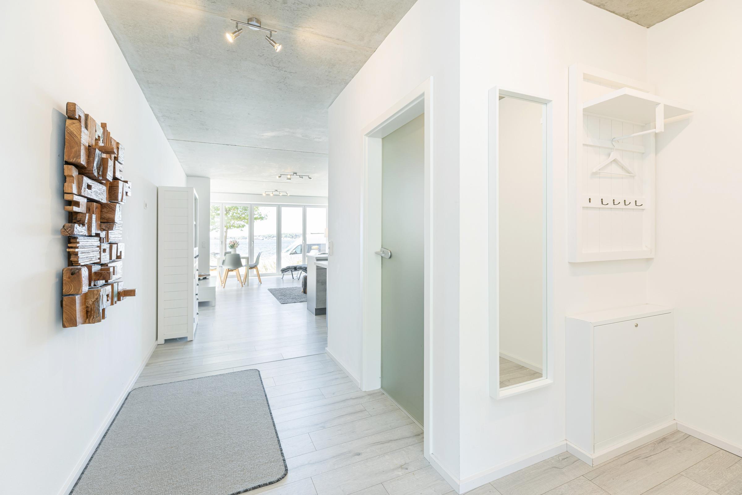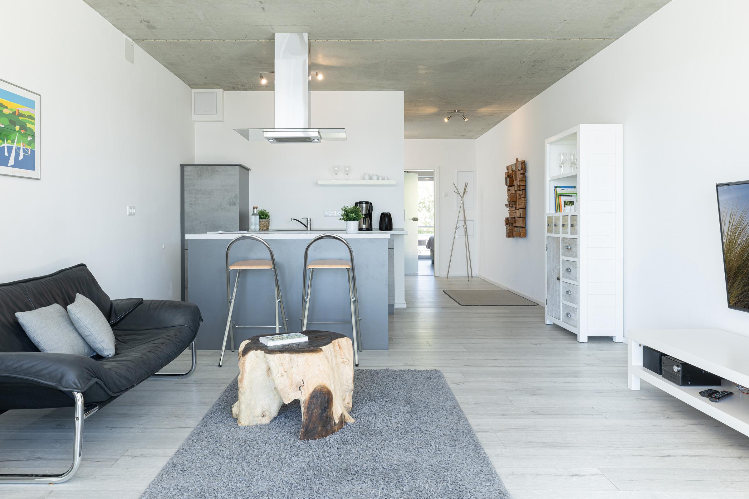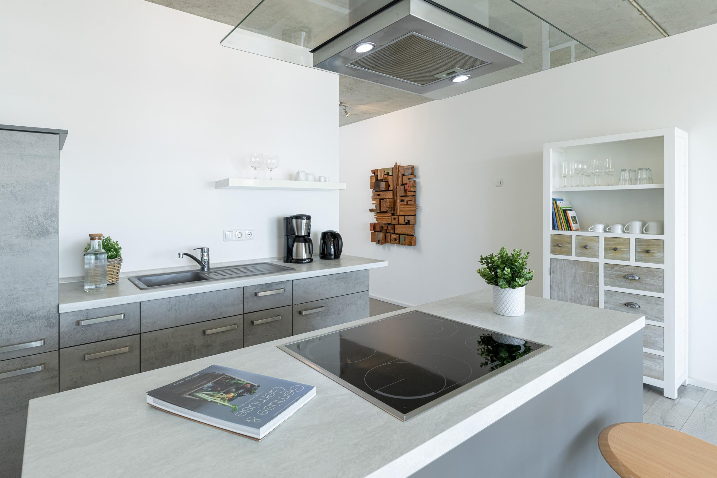 Urlaub der Extraklasse mit beeindruckendem Blick aufs Wasser. Jeder einzelne Raum besticht durch seine großzügige Aufteilung und seine verwendeten Materialien. Der kombinierte Wohnraum ist hochwertig und modern eingerichtet und verfügt über ein bequemes Sofa, Flachbildschirm-TV und eine extra Relax-Liege. Die bodentiefe Fensterfront lädt ganzjährig zum Öffnen und Verweilen ein. Die offene Wohnküche mit Kochinsel und Dunstabzug lässt keine Wünsche offen. Im separaten Schlafzimmer mit Boxspringbett werden Sie erholsame Nächte verbringen. Das komfortable, innenliegende Bad punktet mit einer großen, begehbaren Dusche.