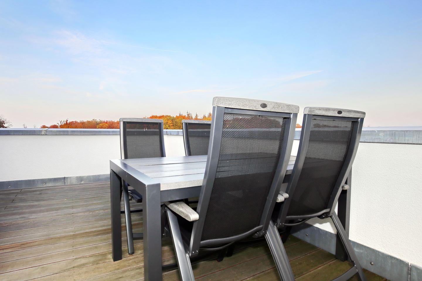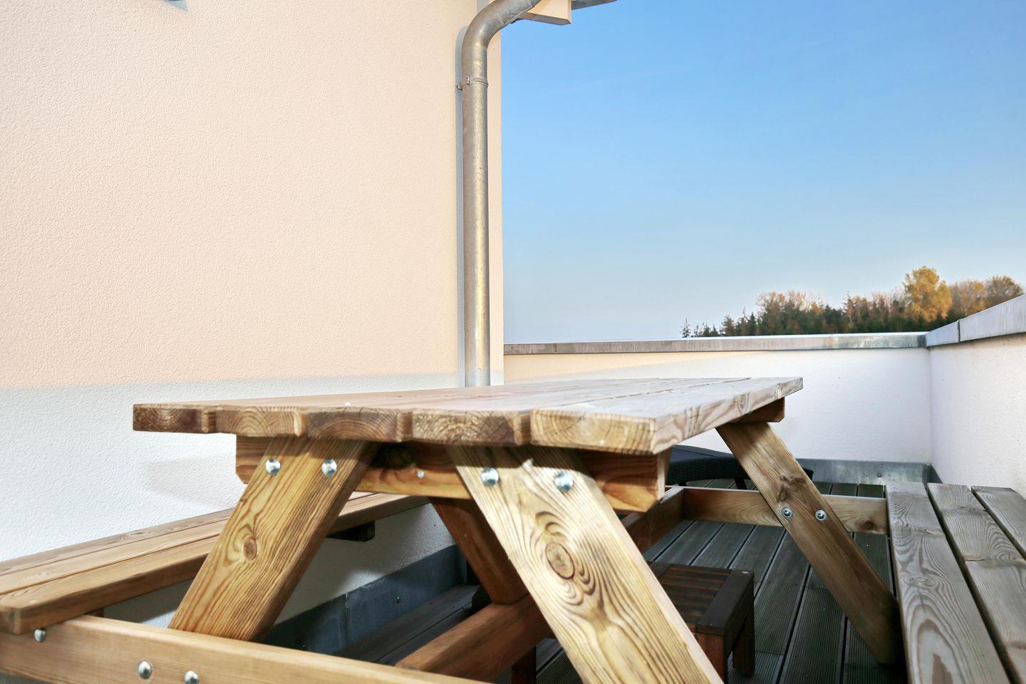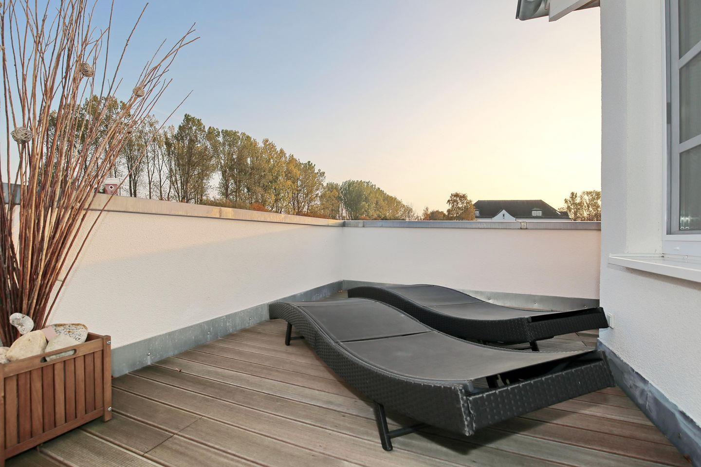 Die Wohnung befindet sich in der 3. Etage (Dachgeschoss) auf der Ostseite des Hauses und hat 2 Dachterrassen. Der Boden ist mit Designbelag ausgelegt. Im offenen Wohnbereich findest du eine moderne Couch mit 2 Sesseln, einen Couchtisch, einen Flachbild-TV und eine Stereoanlage.