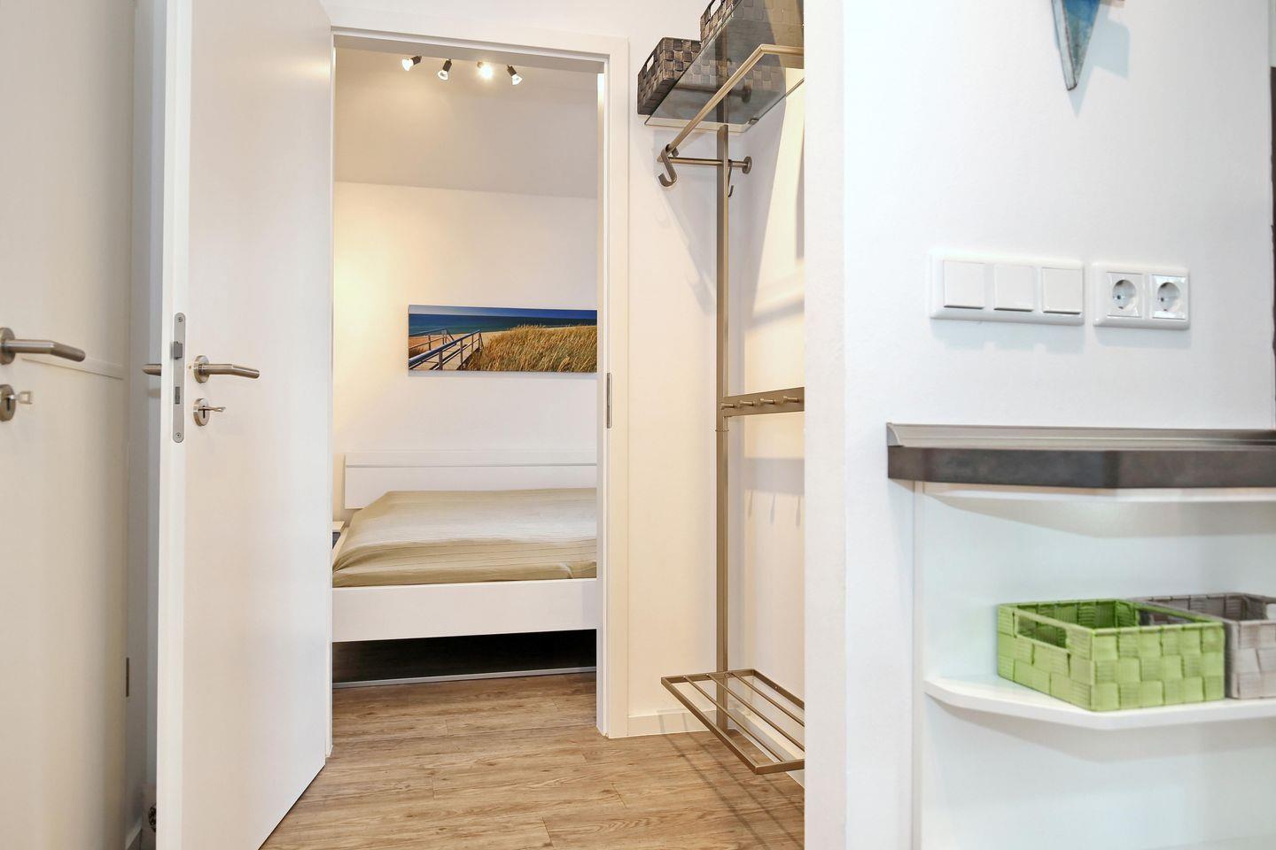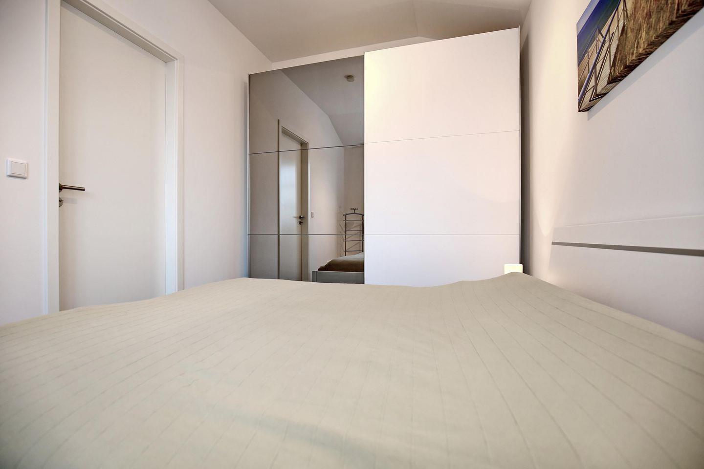Im ersten Schlafzimmer steht dir ein komfortables Doppelbett mit zwei Matratzen (90 cm x 200 cm) zur Verfügung. Der Kleiderschrank bietet ausreichend Stauraum für deine Sachen. Im zweiten Schlafzimmer gibt es ein Etagenbett, und auch hier kannst du deine Sachen im Kleiderschrank verstauen. Natürlich gehört auch ein Duschbad mit Föhn und Dusche zur Wohnung.