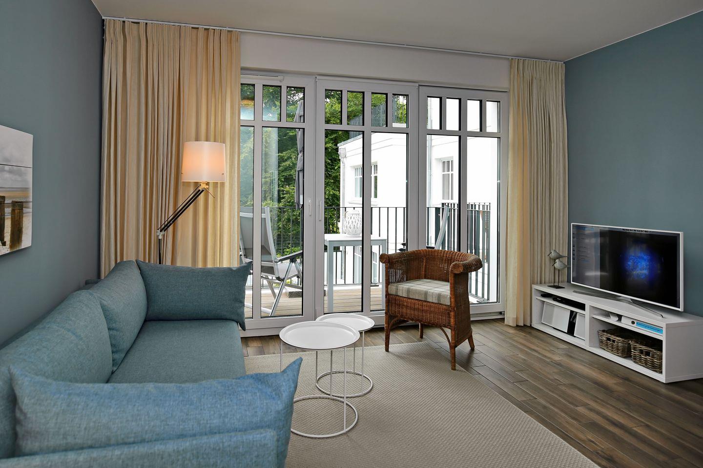 Die Ferienwohnung 26 im Linden-Palais in Heiligendamm ist eine 51 m² große 2-Zimmer-Wohnung für bis zu 2 Personen mit Balkon und Sauna. Zum Haus gehören zwei Fahrstühle.