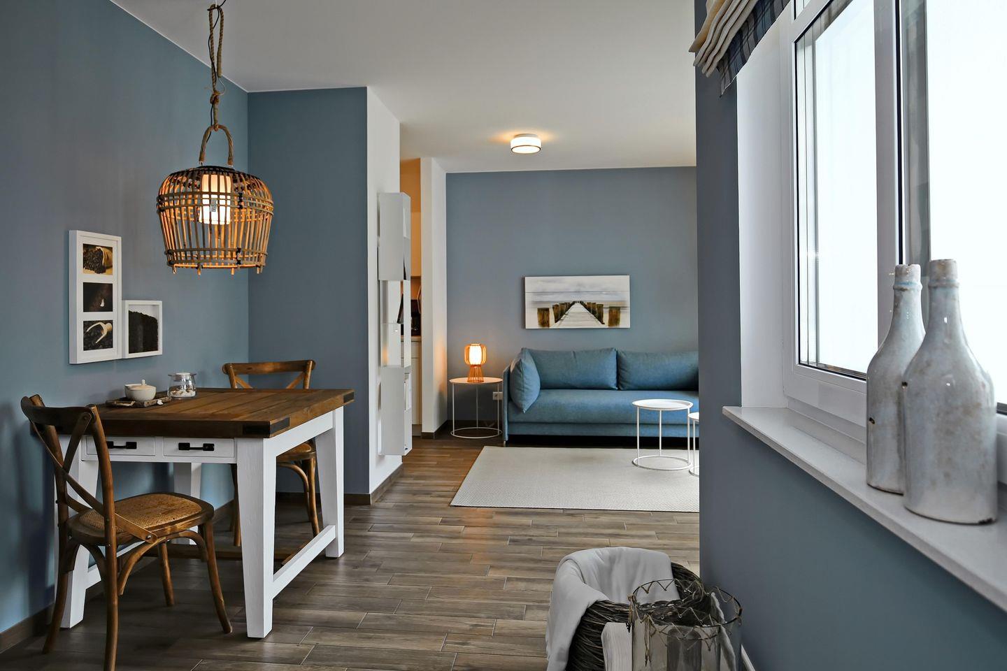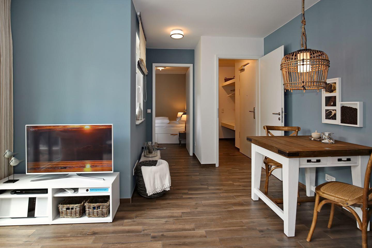 Im großzügigen Wohnbereich der Ferienwohnung laden eine moderne Couch, ein Flatscreen-TV sowie ein DVD-Player zu geselligen Abendstunden ein. Der gemütliche Essbereich ist im Wohnbereich integriert und gewährt Ihnen viel Platz für entspannte Mahlzeiten.