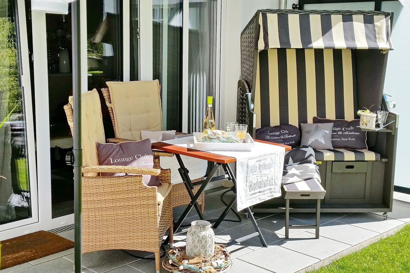 Die 43 m² große 2-Zimmer-Ferienwohnung befindet sich im Erdgeschoss des Hauses. Genießen Sie die Sonnenstunden auf der möblierten Süd-Terrasse. Die Ferienwohnung bietet mit einem Wohn- und Essbereich, einer Küchenzeile, einem Schlafzimmer und einem Duschbad bis zu 3 Personen Platz für schöne Urlaubstage an der Ostsee. Bis zum Strand sind es nur circa 50 Meter.