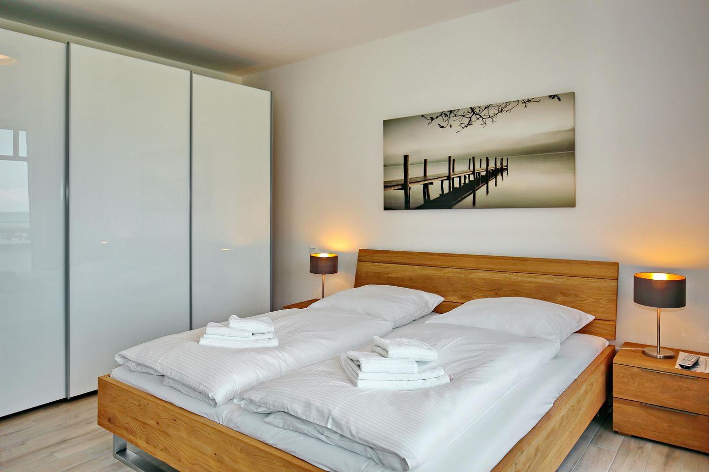 Das Schlafzimmer ist für Sie mit einem komfortablen Doppelbett (2 x 90 x 200 cm) und einem Flachbild-TV eingerichtet. Der große Kleiderschrank bietet ausreichend Stauraum für Ihre Sachen. Die Schlafcouch im Wohnzimmer (150 x 190 cm) bietet 2 weiteren Personen einen bequemen Schlafplatz. An allen Fenstern, finden Sie Verdunklungsplissees vor.