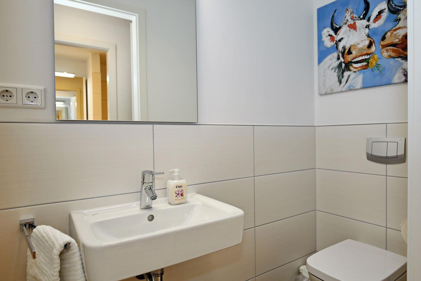 Das moderne Duschbad der Ferienwohnung verfügt über eine ebenerdige Dusche und einen Föhn. In der gesamten Wohnung sind Bodenfliesen verlegt. Es handelt sich um eine Nichtraucher-Wohnung. Haustiere sind auf Anfrage erlaubt.