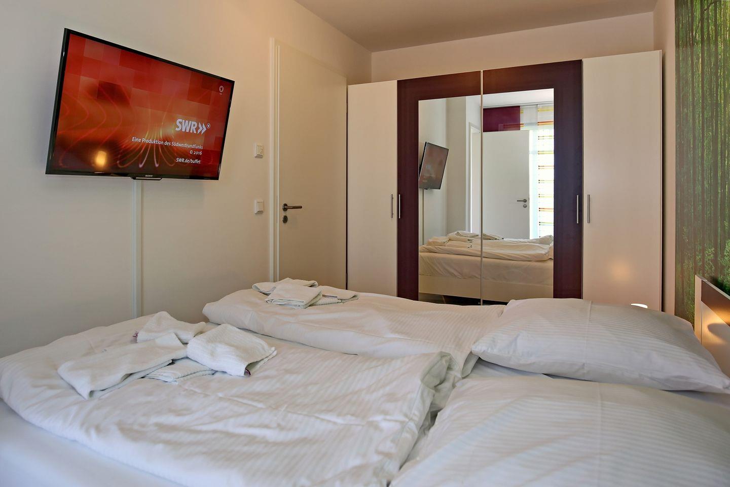 Im Schlafzimmer lädt Sie ein komfortables Doppelbett (90 x 200 cm) zum erholsamen Schlaf ein. Der große Kleiderschrank bietet viel Stauraum für Ihre Sachen. Die Schlafcouch im Wohnbereich der Ferienwohnung wird mit wenigen Handgriffen zu einem bequemen Schlafplatz für 2 Personen (180 x 200 cm). Für unsere Kleinsten steht ein Kinderreisebett kostenlos zur Verfügung.