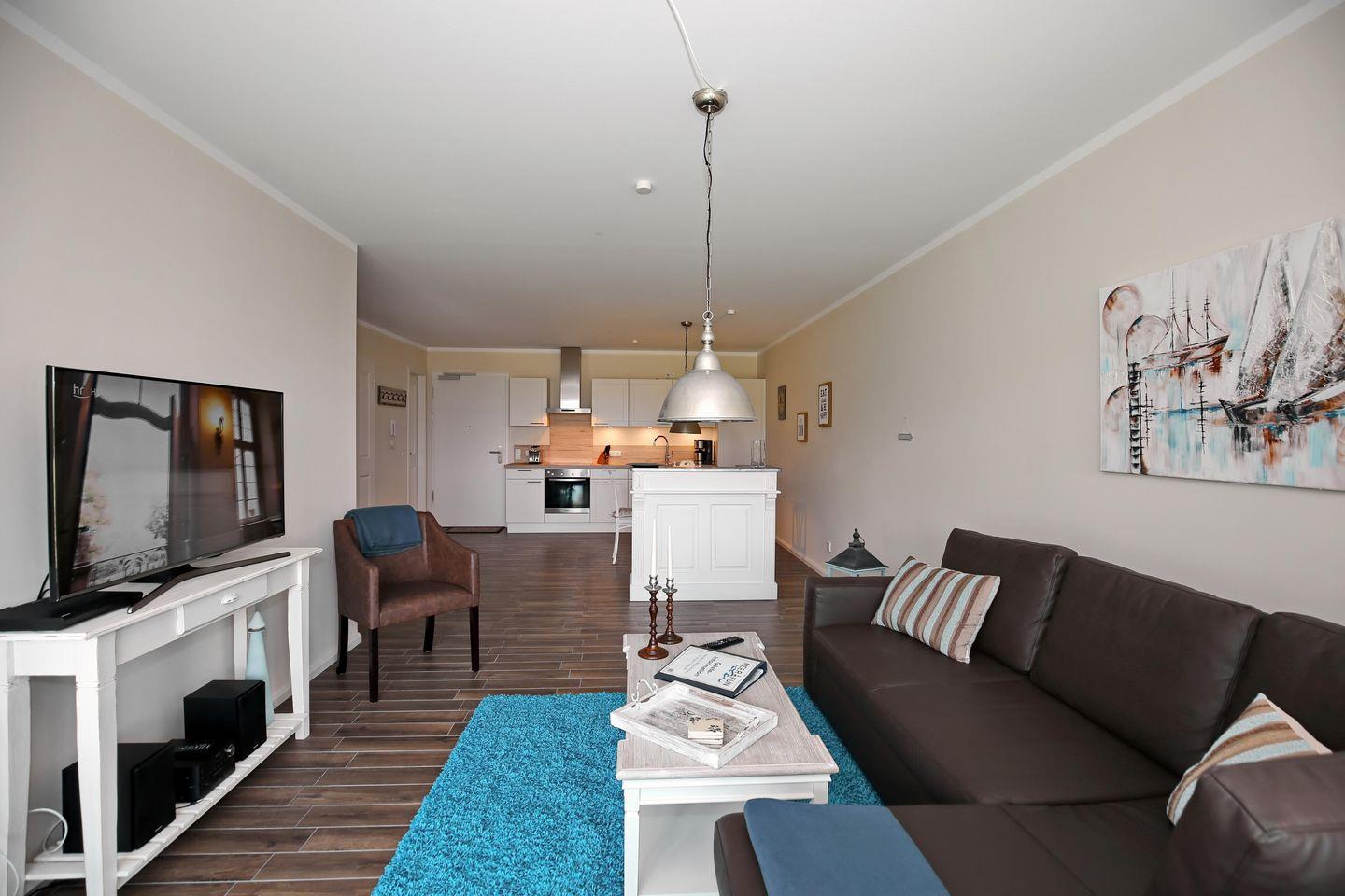 Der Wohnbereich der Ferienwohnung ist mit einer gemütlichen Couchgarnitur, einem Flatscreen-TV, einer Stereoanlage und einem Blu-Ray-Player eingerichtet. Genießen Sie hier gesellige Abende. In das WLAN des Hauses können Sie sich kostenlos einloggen. Der integrierte Essbereich bietet Ihnen viel Platz für gemeinsame Mahlzeiten.