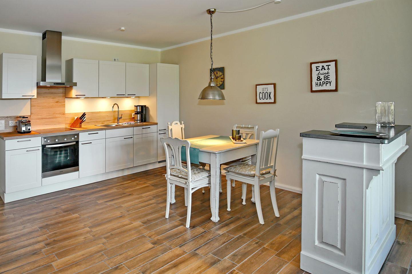 Die moderne Küchenzeile ist voll ausgestattet. Mit einem vierfachem Cerankochfeld, einem Backofen, einem Geschirrspüler, einer Mikrowelle sowie einem Kühlschrank mit Gefrierfach fehlt es Ihnen in dieser Küche an Nichts. Selbstverständlich stehen Ihnen hier auch ein Wasserkocher, eine Kaffeemaschine und ein Toaster zur Verfügung.