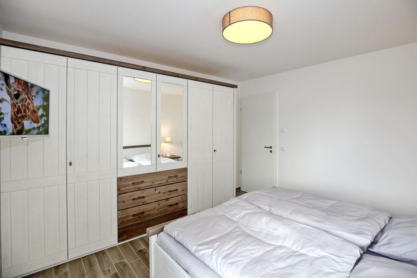 Das Schlafzimmer ist für Sie mit einem Doppelbett (2 x 90 x 200 cm) und einem TV eingerichtet. Für Ihr Urlaubsgepäck finden Sie einen großen Kleiderschrank vor. Im zweiten Schlafzimmer befinden sich zwei zusammengeschobene Einzelbetten (90 x 200 cm) für 2 Personen. Die Schlafcouch im Wohnzimmer bietet einer weiteren Person einen bequemen Schlafplatz.