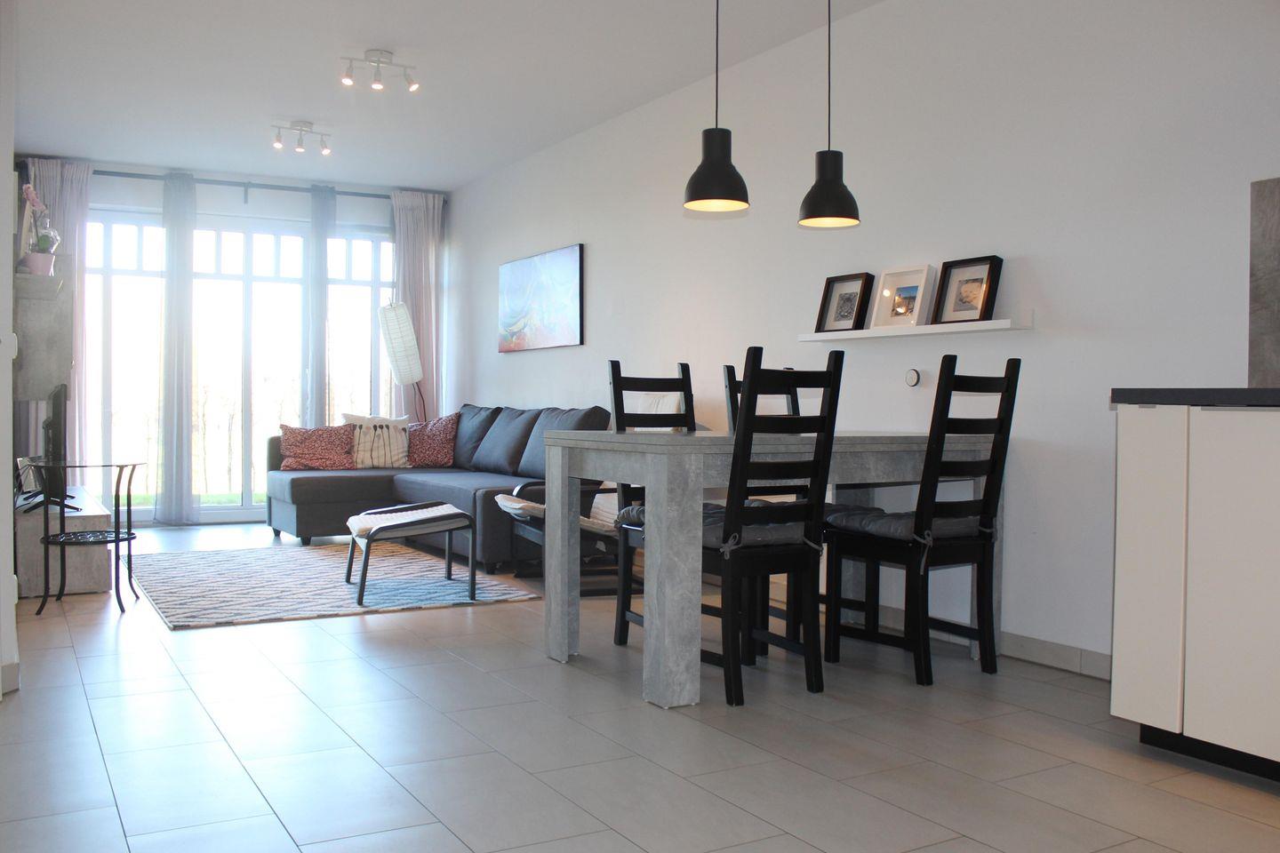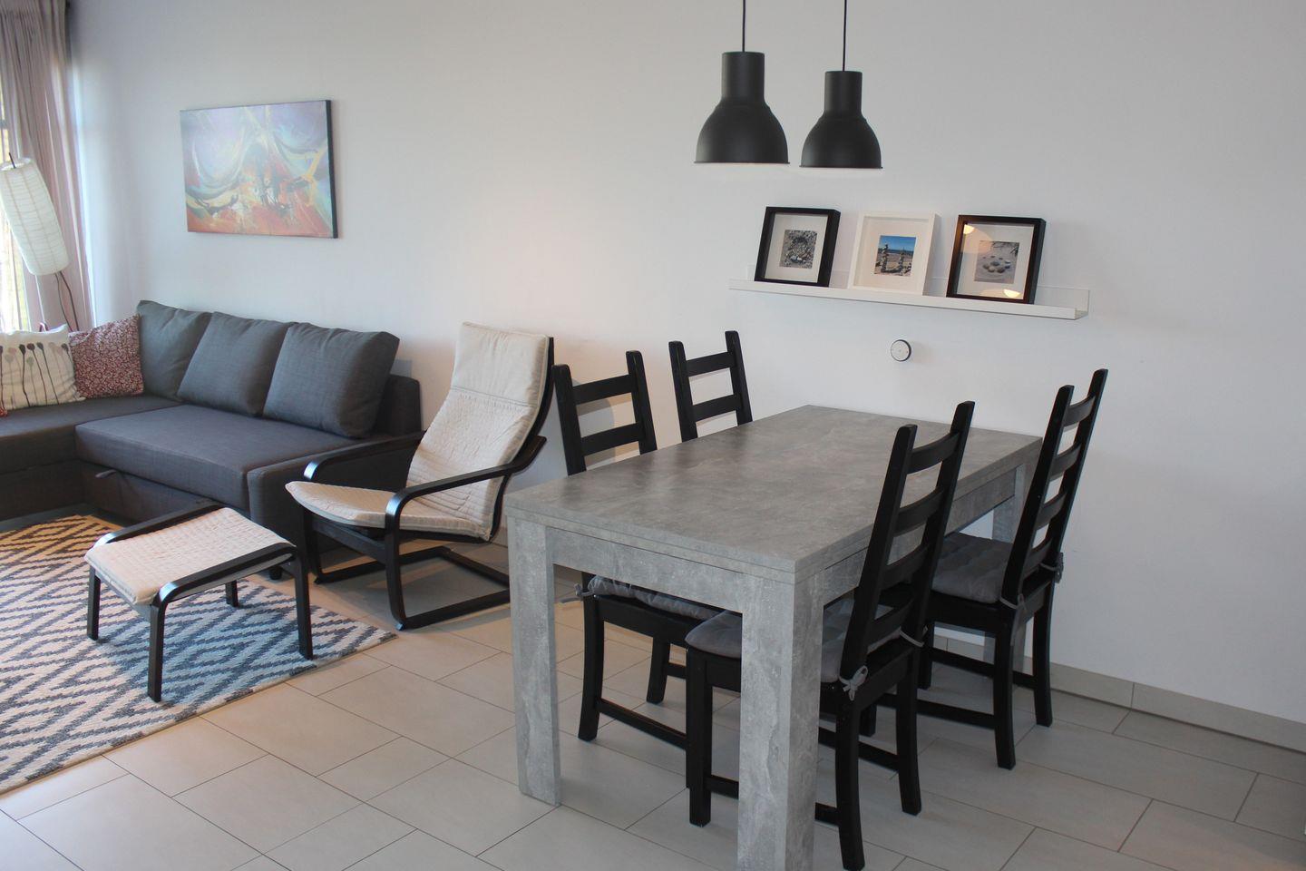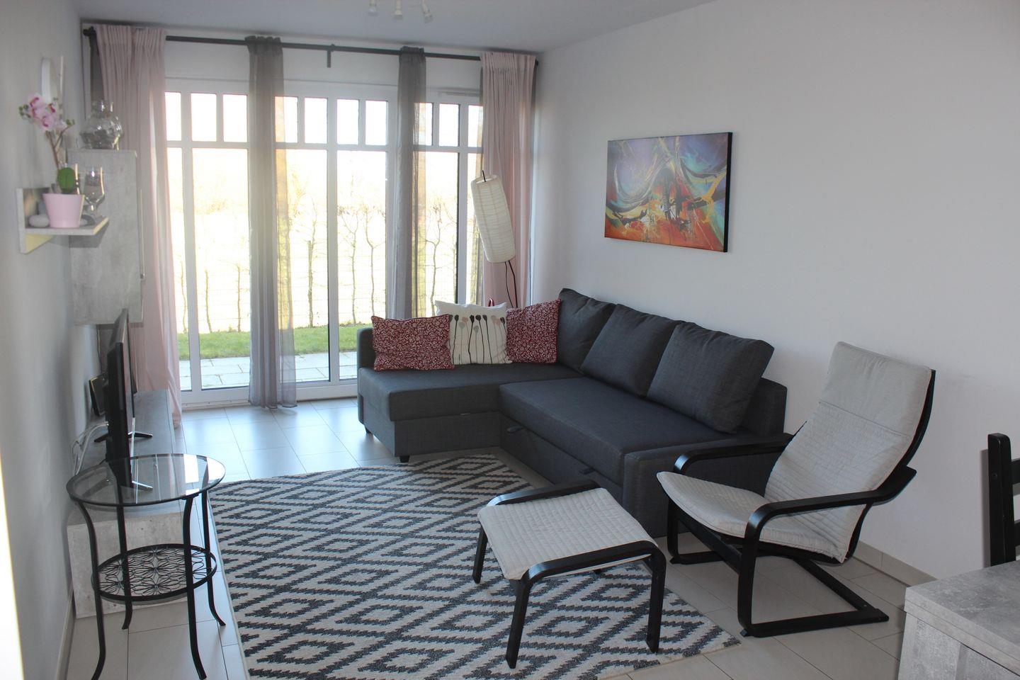Der Wohnbereich der Ferienwohnung ist mit einer gemütlichen Couchgarnitur, einem Flatscreen-TV und einem DVD-Player eingerichtet. Genießen Sie hier gesellige Abende. In das WLAN des Hauses können Sie sich kostenlos einloggen. Der integrierte Essbereich bietet Ihnen viel Platz für gemeinsame Mahlzeiten.
