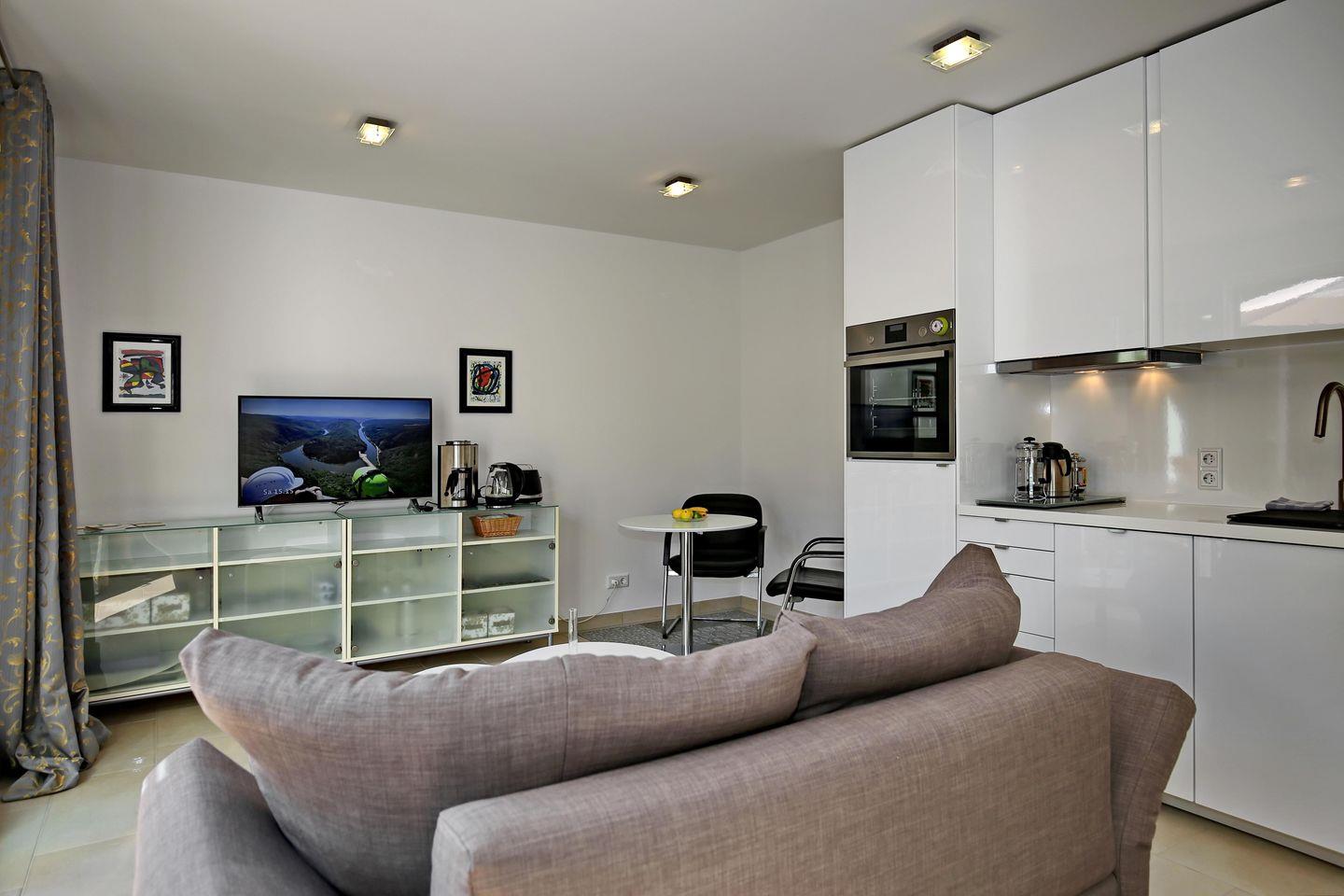 Die exklusive Küchenzeile ist unter anderem mit einem Geschirrspüler, einem zweifachem Cerankochfeld, einem Backofen sowie einem Kühlschrank mit Gefrierfach, einem Toaster, einem Wasserkocher und einer Filterkaffeemaschine voll ausgestattet.