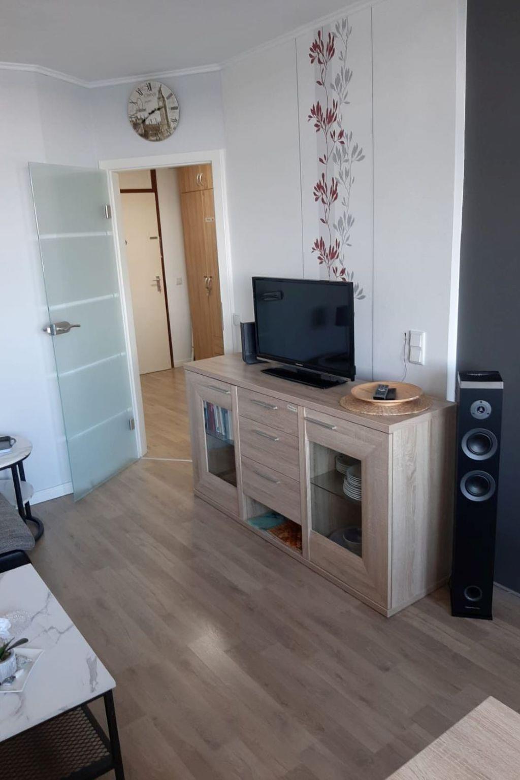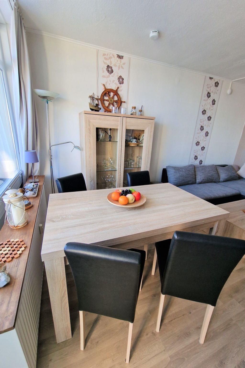 The living room is equipped with a new sofa set (also as a sofa bed), LCD TV/stereo music tower with Bluetooth, True Wireless, USB/SD, FM radio and WLAN. The dining area with extendable table and 4 chairs and much more.