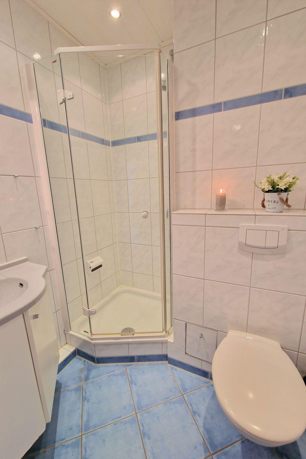 Bright bathroom with heating, towel warmer, WC, washbasin with vanity unit, mirror cabinet, hairdryer, glass shower cubicle, hot water