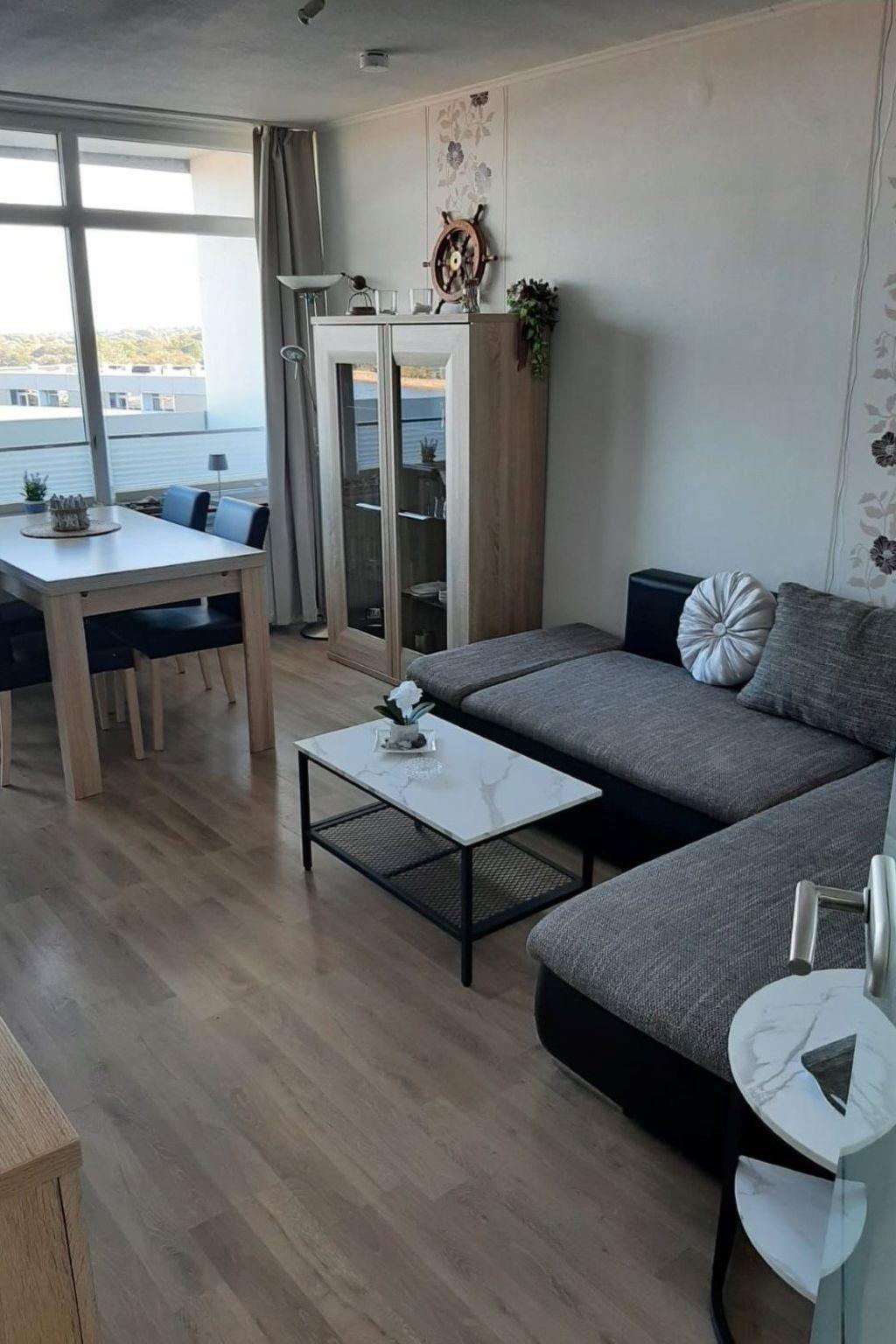 The dining area with extendable table and 4 chairs, floor lamp, small buffet with glasses and much more. Large window front with pleated blinds and view of the lake/yacht harbour and Baltic Sea. Exit to the balcony.