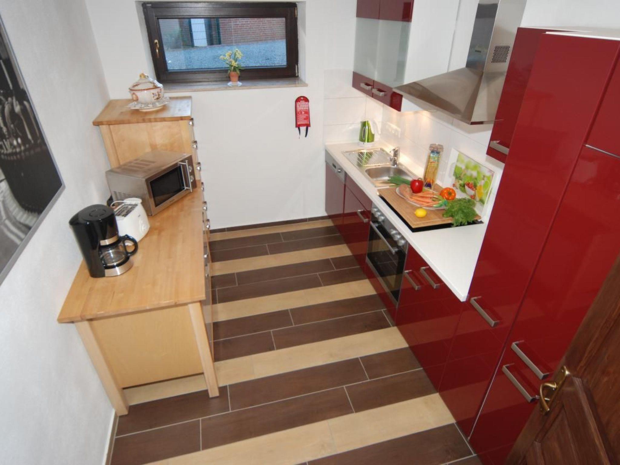 The spacious separate fully equipped kitchen with oven, ceramic hob, dishwasher, coffee/pad machine and various small appliances (kettle, toaster, microwave, etc.) invites you to cook together. The spacious bedroom with double bed is furnished with solid wooden furniture. A modern, spacious and comfortable bathroom with shower completes the picture. In the utility room you will find 2 washing machines and 2 tumble dryers. There are ironing facilities and an additional freezer, outside a covered drying area with rotary dryer. For a nice start to your holiday, a bouquet of flowers and a bottle of sparkling wine awaits you. We will welcome you personally at the front door, show you around your holiday flat, hand over the keys and see you off after your holiday.