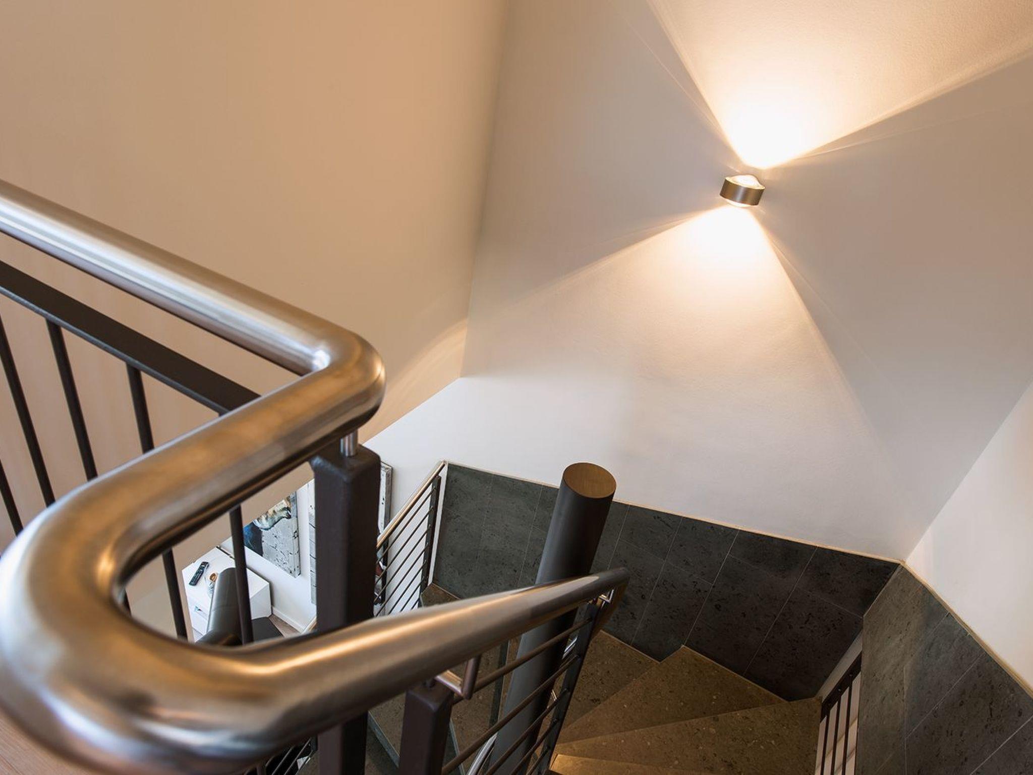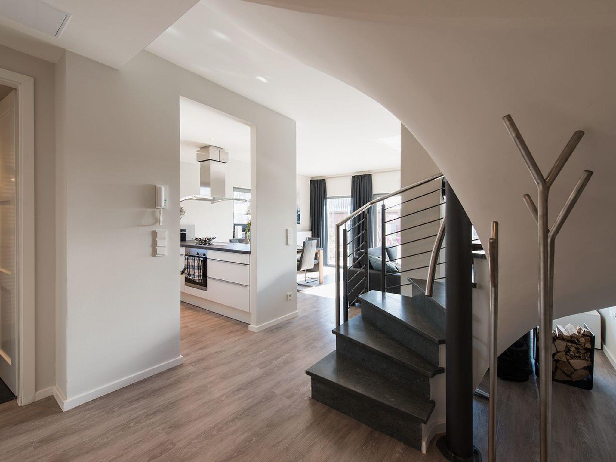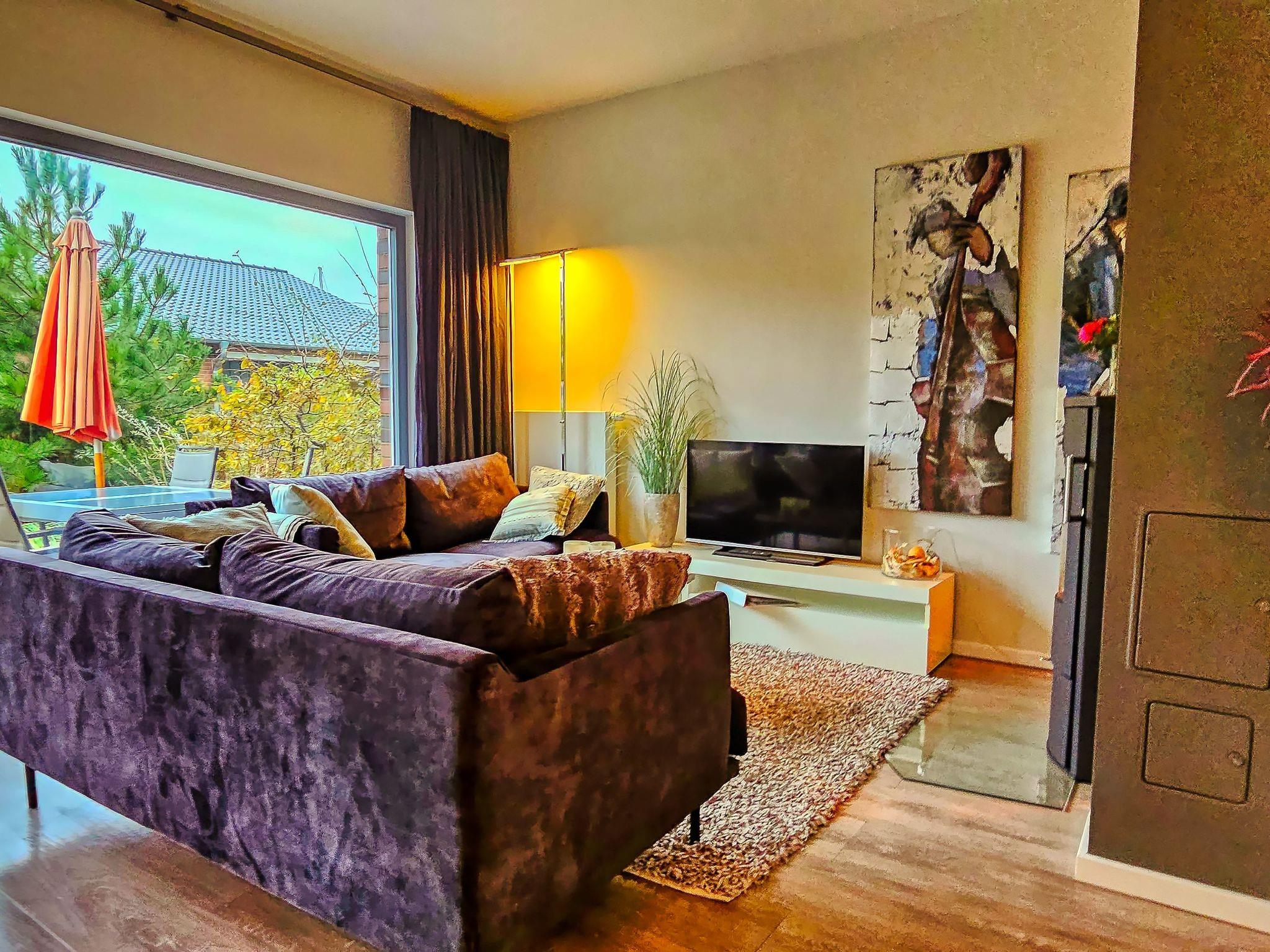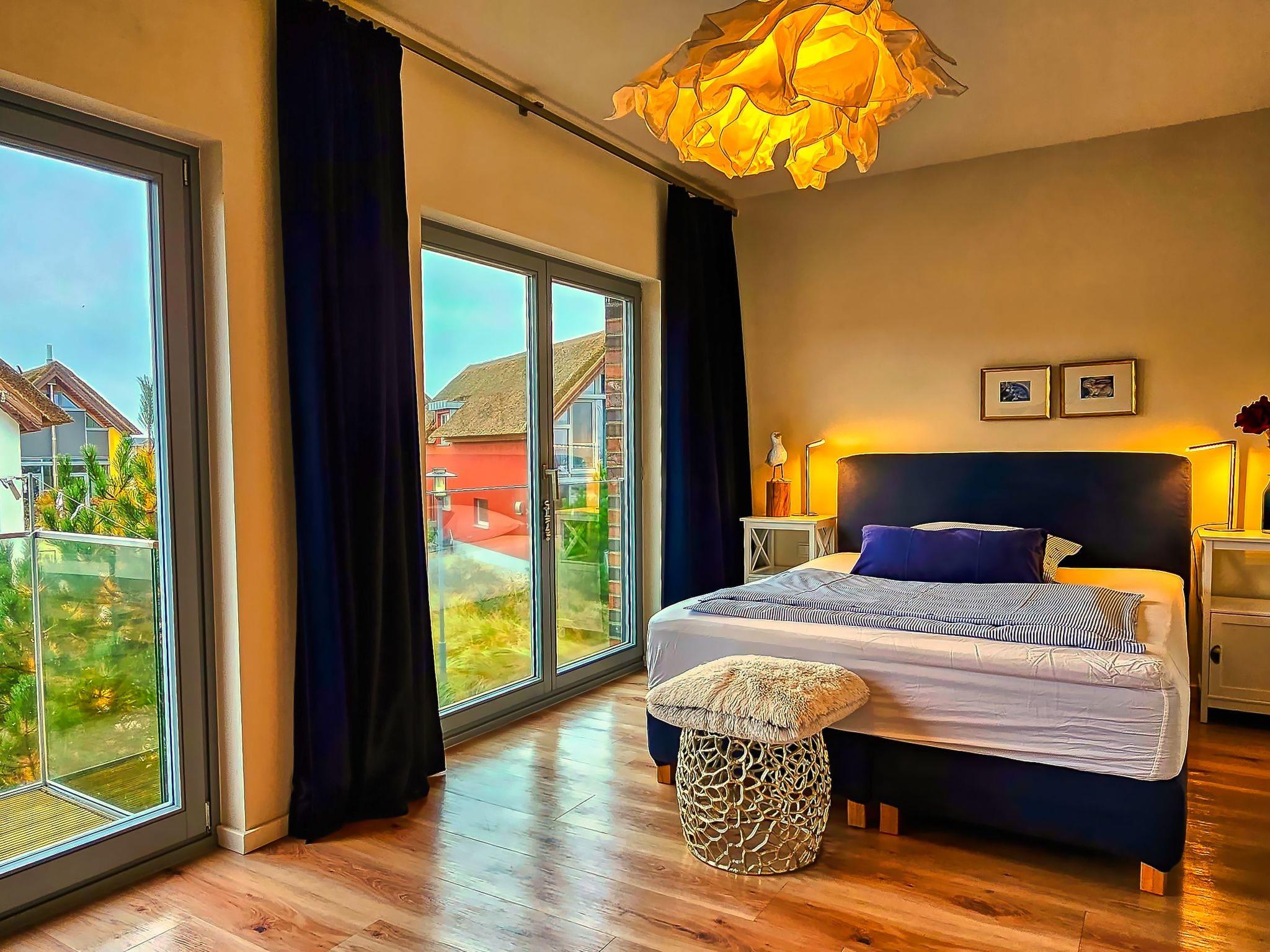 The exclusively furnished 108m² maisonette apartment on two floors offers everything you need for a special holiday. All the rooms have floor to ceiling windows offering ample daylight, as well as an antiallergenic and family-friendly interior and access to the terrace, balcony or loggia. The ground floor has a generous living and dining room with a high-quality open kitchen equipped with a ceramic hob, oven, extractor fan, dishwasher, fridge with a freezer compartment and all accessories. The table provides ample space for all guests. The living room features a fireplace. The flickering fire invites you to relax after an enjoyable day at the beach. There is also a modern shower room on the ground floor with a sauna – recommended for relaxing well-being after long walks on the beach. The living room opens onto the big fully-furnished terrace facing the yacht harbour. Open stairs lead to the upper floor. The two bedrooms each have a balcony and are furnished with comfortable box spring beds. There is a fifth bed that can also be used as a sitting corner for chilling out during the sunset, as well as a desk. The same floor has a fully fitted modern bathroom with a shower and bath. You can find a washing machine and dryer in a separate storage room. Wi-Fi is available throughout the house and a flatscreen TV, radio and Internet are provided.