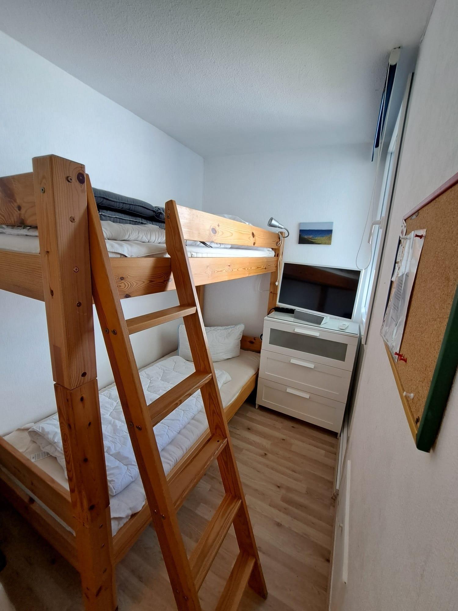 Gemütliche Ferienwohnung in der 3. Etage mit Balkon, 1 komb. Wohn-Schlafraum mit Doppelbetten, neues Laminat, TV und Radio, 1 sep. Kinderzimmer mit Etagenbett u. TV, neue Küche mit Backofen, Dusche, WC, Balkon zur Seeseite.