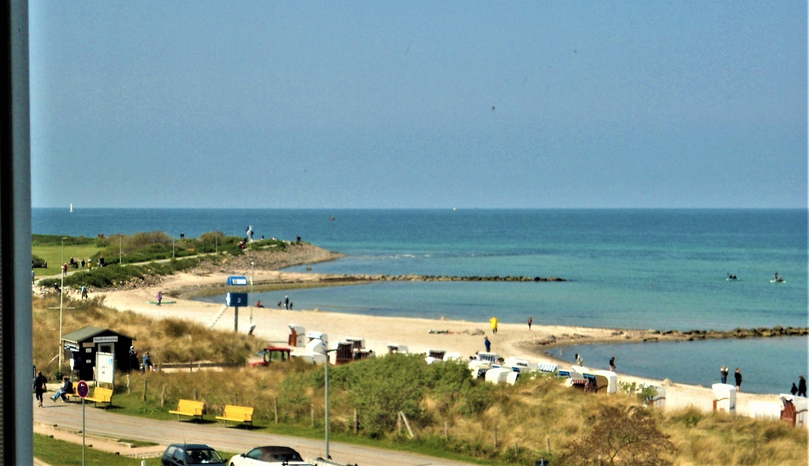Blick aus der 3. Etage auf die nahe Ostsee, die Fehmarnsundbrücke und bis zur