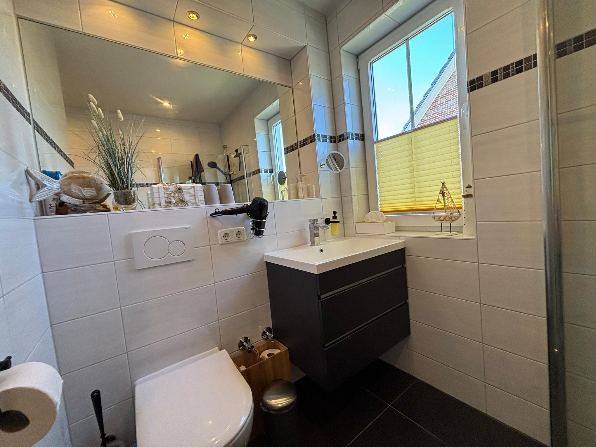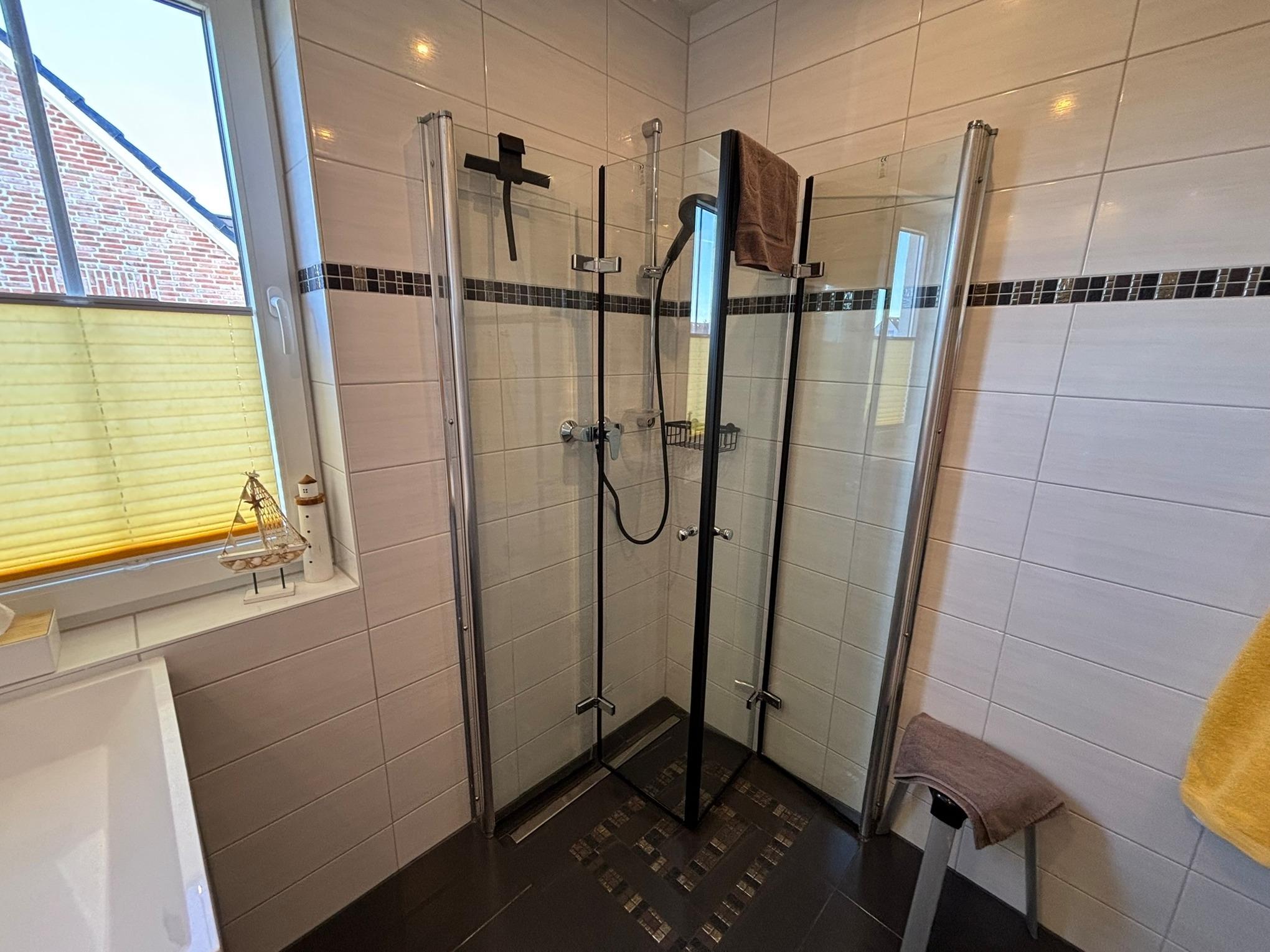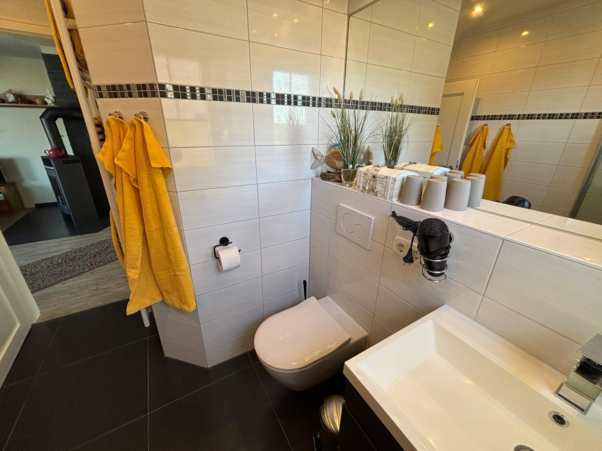 Das Bad verfügt über eine bodentiefe Dusche und einem Handtuchheizkörper. Bettwäsche und Handtücher, sowie ein Wechselsatz Handtücher sind inklusive.