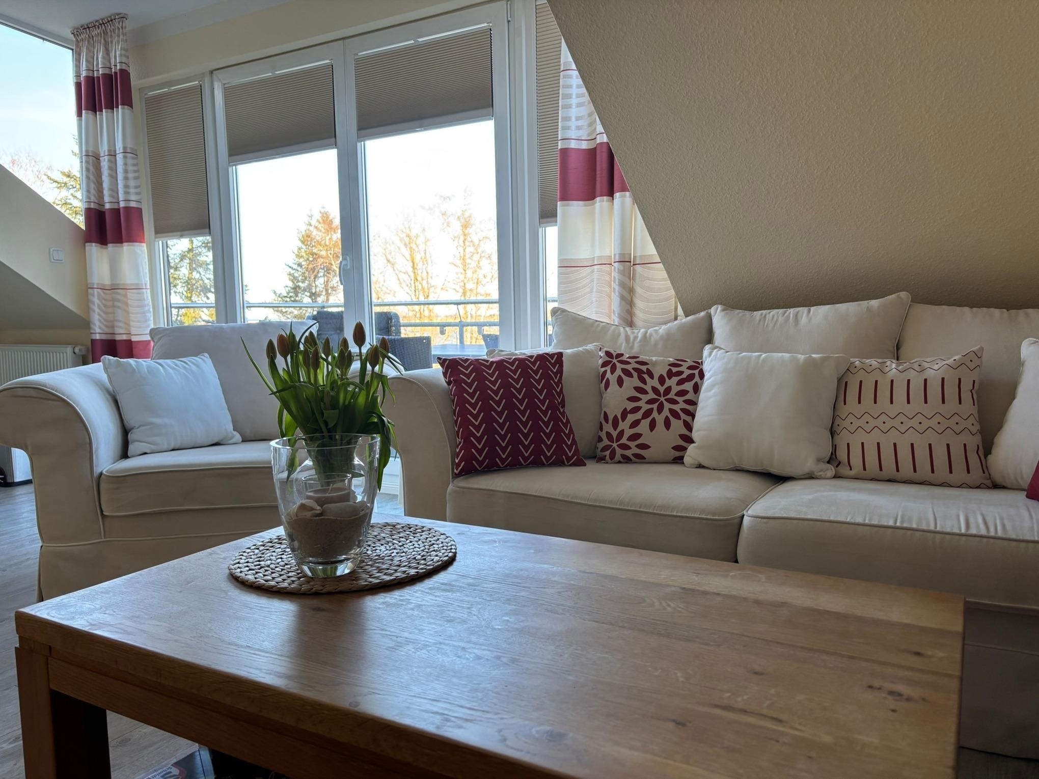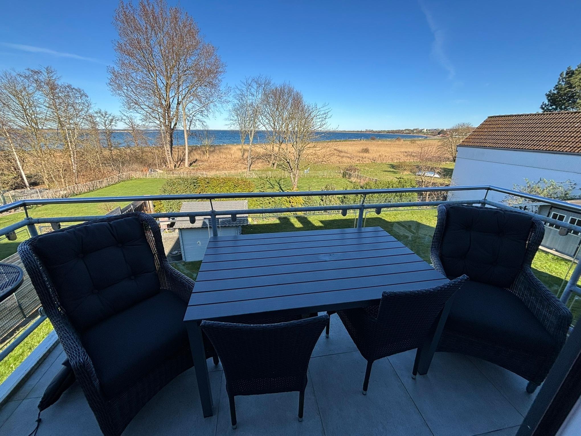 Im Wohn-Essbereich genießen Sie den Blick vom Balkon auf die Reede von Heiligenhafen, dem Leuchtturm von Strandhusen und auf eindrucksvolle Sonnenaufgänge.