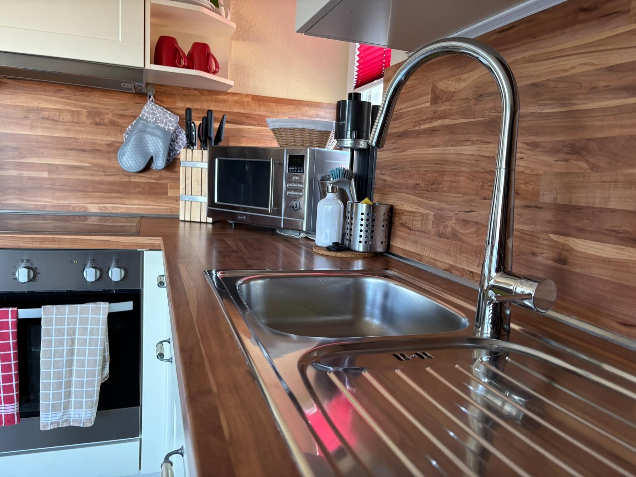 Im Wohnbereich befindet sich eine WII mit kindgerechten Spielen und Brettspiele, ein Kaminofen mit Brennholz und ein Smart-TV mit Disney+.
