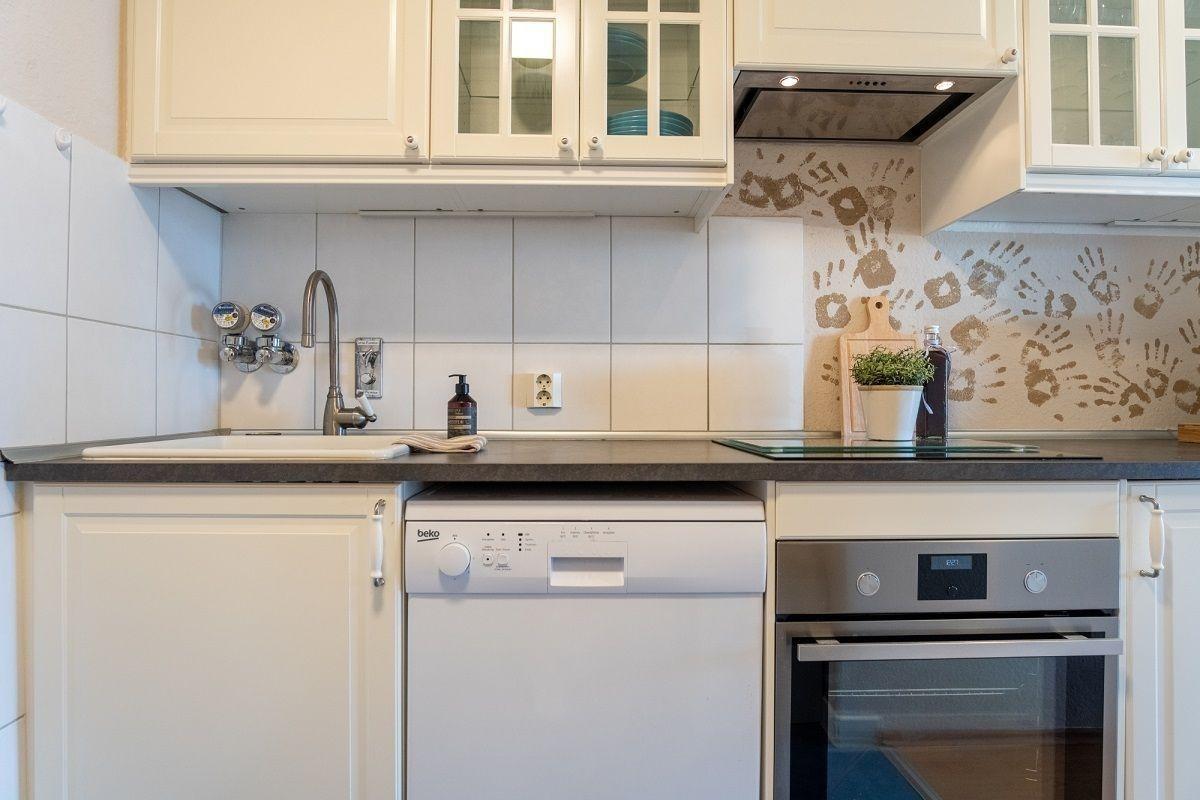 Der offene Küchenbereich ist, für den Urlaubsbedarf, voll ausgestattet. Eine Kaffeemaschine gehört ebenso dazu, wie der Wasserkocher und ein Toaster. Geschirr und Besteck sind ausreichend vorhanden. Außerdem steht Ihnen noch ein Backofen und ein Geschirrspüler zur Verfügung. Das Badezimmer wurde ebenfalls modernisiert: die Badewanne verfügt über eine Glastrennwand.