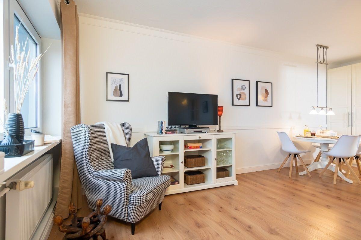 Urlauben Sie auf großzügigen 37 m² (2. Etage) im "Strandhotel" auf dem Steinwarder - nur wenige Meter vom Badestrand entfernt. Die zuletzt 2021 modernisierte Ferienwohnung verfügt über einen großen Wohnschlafbereich mit einer gemütlichen Sofaecke (Schlafsofa) und Flatscreen-TV. Im angrenzenden Essbereich finden bequem vier Personen Platz zum Schlemmen. Der offene Küchenbereich ist, für den Urlaubsbedarf, voll ausgestattet. Eine Kaffeemaschine gehört ebenso dazu, wie ein Wasserkocher und ein Toaster. Geschirr und Besteck sind ausreichend vorhanden. Das Alkovenschlafzimmer ist mit zwei komfortablen Einzelbetten eingerichtet. Das Badezimmer wurde ebenfalls modernisiert und verfügt über eine Dusche mit Glastrennwand.