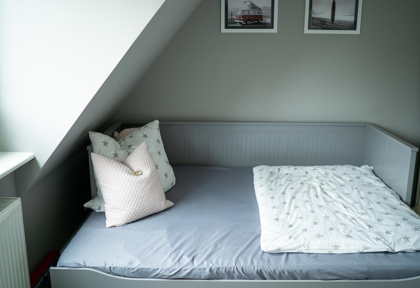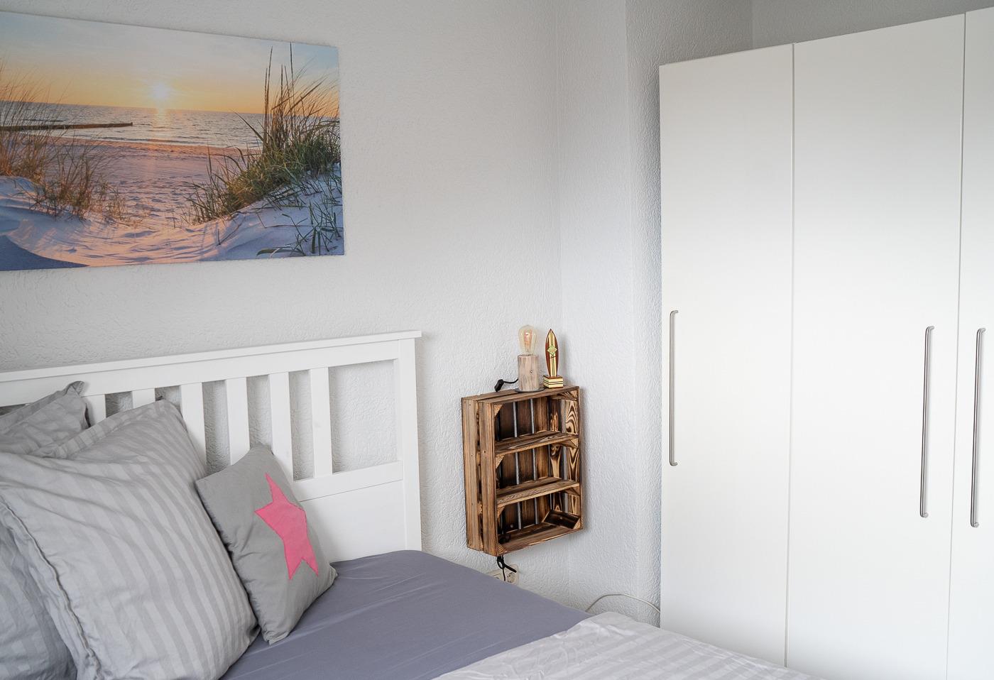 Die Treppe hinauf führt zu den Schlafzimmern. Ein Zimmer ist mit einem Doppelbett (180 x 200 cm) und einem Kleiderschrank ausgestattet. Das zweite Zimmer verfügt über ein Bett (90 x 200 cm) und ein Schlafsofa, das herausgezogen Platz für Zwei bietet. Dieses Zimmer ist gut für die Kinder geeignet.