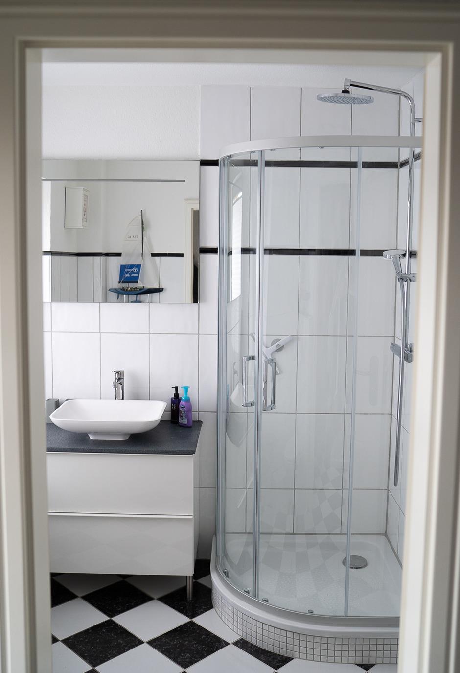 Das Haus betretet Ihr durch den Flur. Links ist das neue Duschbad mit Waschtisch und WC.
